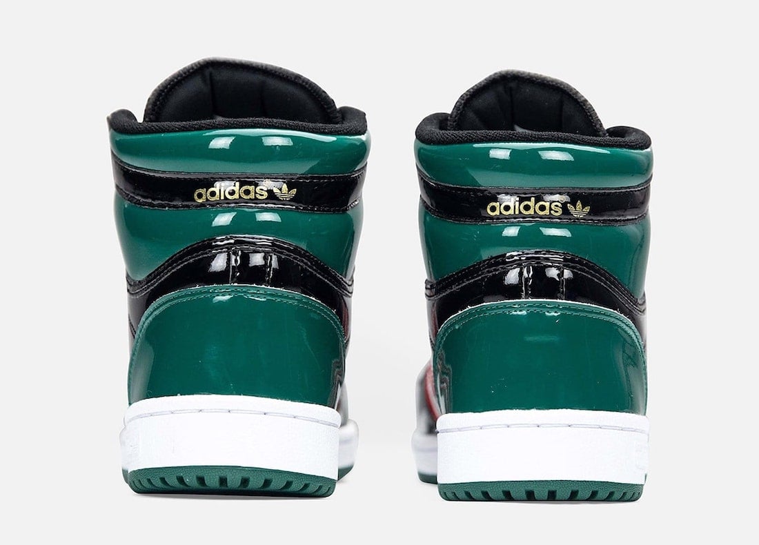 This adidas Top Ten features a Miami color scheme. Highlighted with full patent leather on the upper while Green and Black run throughout. Next, Orange adorns the Three Stripes branding hits the sides while Gold hits the branding on the tongues. Finally, a White midsole and a Green rubber outsole complete the look.
