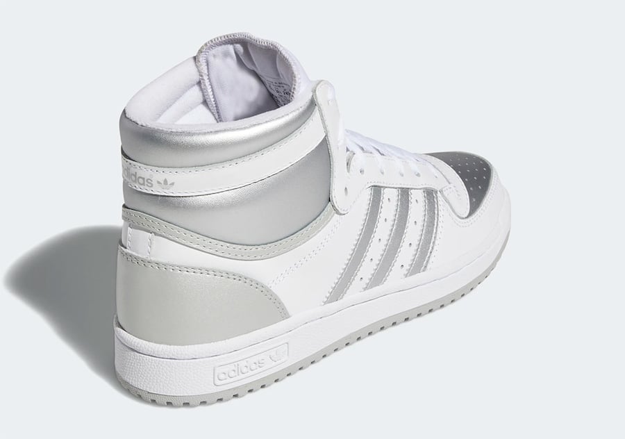Looking closer this pair features White leather on the base while Metallic Silver is seen on the toe, Three Stripes branding, ankle and tongue label. Grey is seen on the heel and seams while a White midsole and Grey rubber outsole finishes the look.