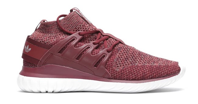 The latest adidas Tubular Nova is constructed with Primeknit across the base while leather covers the cage and heel wrap. Using predominate Mystery Red across the uppers which is also joined by Burgundy. Following we have accents of White which hits the adidas branding across the heel, midsole and across the outsole.