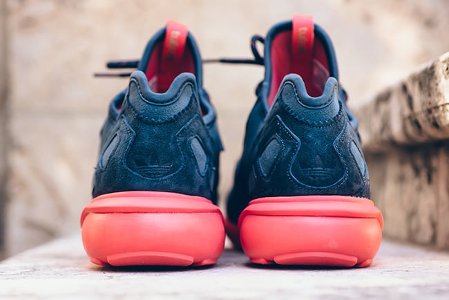 Changing things up, adidas went with a suede upper instead of the usual fused overlays. The uppers are done in midnight navy which also lands on the neoprene tongue. Following is coral which runs through the midsole and sole and is then added to the tongue tab, hinted through the laces and inside of the tongue.