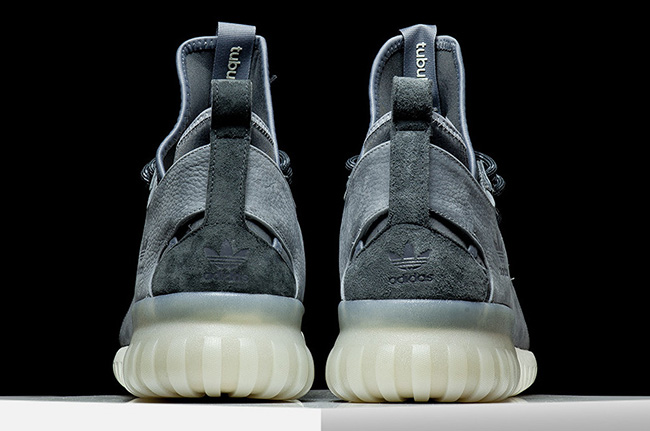 This pair of the adidas Tubular X will feature all the materials most of us love like Primeknit on the uppers which extends through the toe box. On the collar is neoprene which aids in comfortability while the X located by the heel is done with a pebbled leather. As you can see, they feature shades of Grey while the midsole and outsole starts out in White but is finished with a translucent tint.