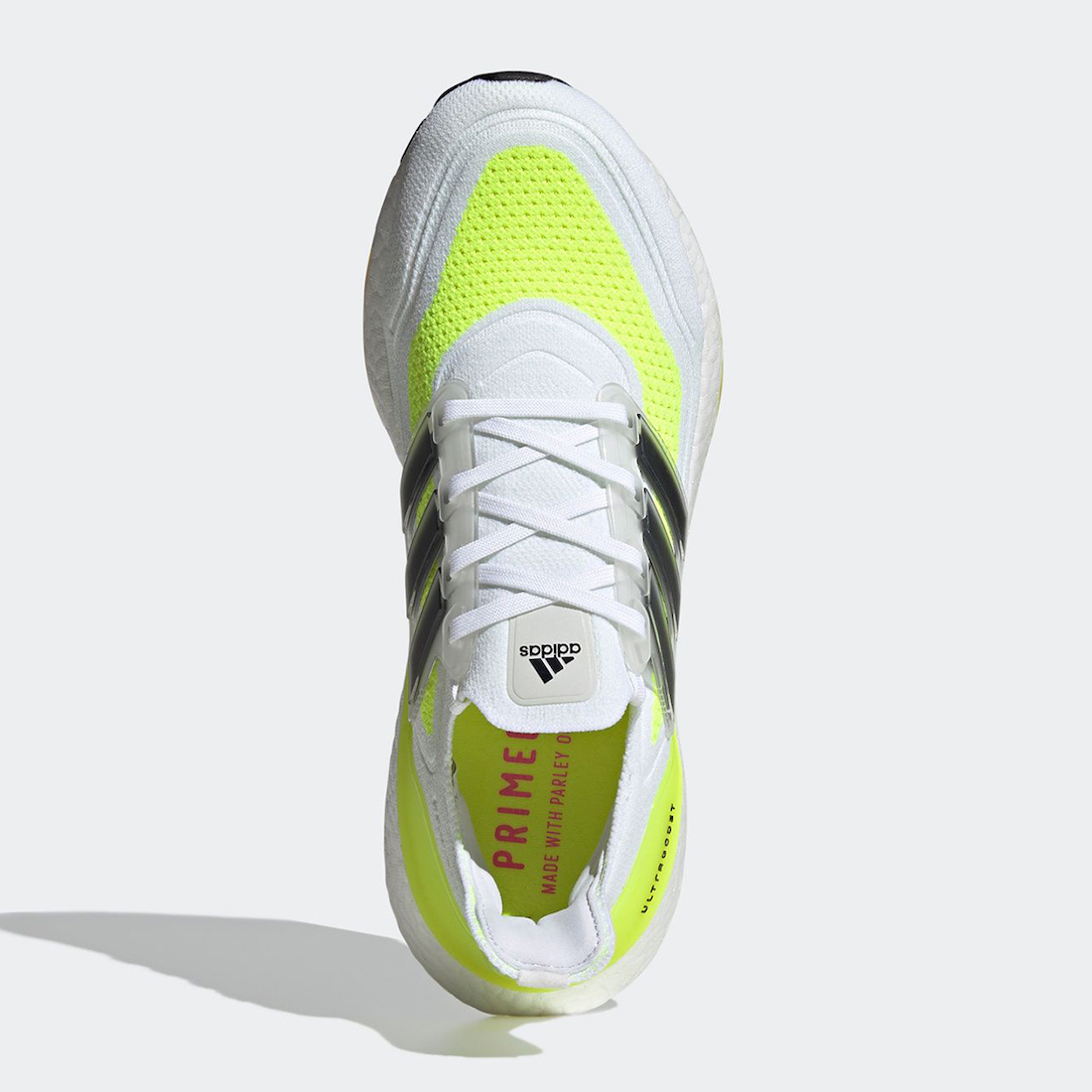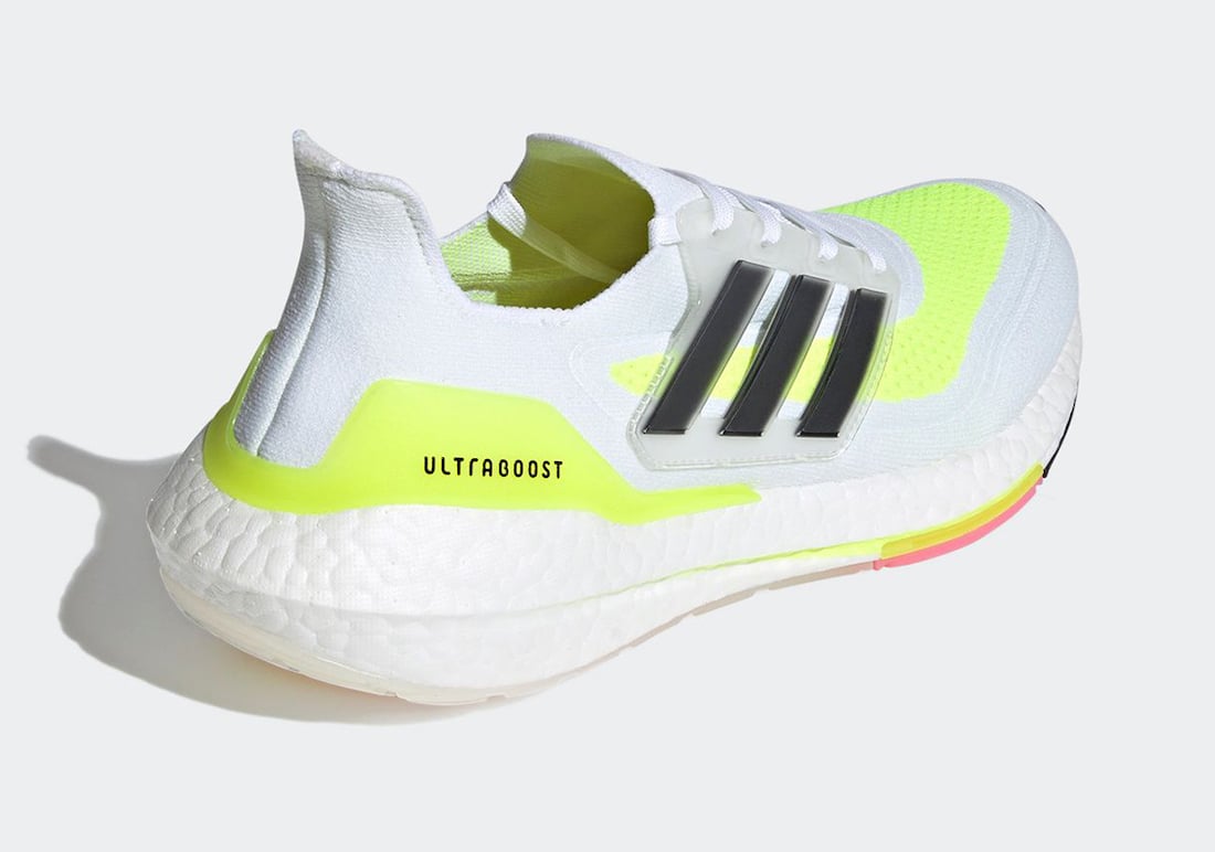 Looking closer, this adidas Ultra Boost 2021 comes dressed in a Footwear White, Core Black, and Solar Yellow color combination. It’s Constructed with Primeblue, a high-performance recycled material that features Parley Ocean Plastic. Also, 50% of the upper is textile, and 75% of the textile is Primeblue yarn. Next, we have a translucent lace cage with Black Three Stripes branding and Solar Yellow details run throughout. Finally, pink accents and a White Boost midsole finishes the look.