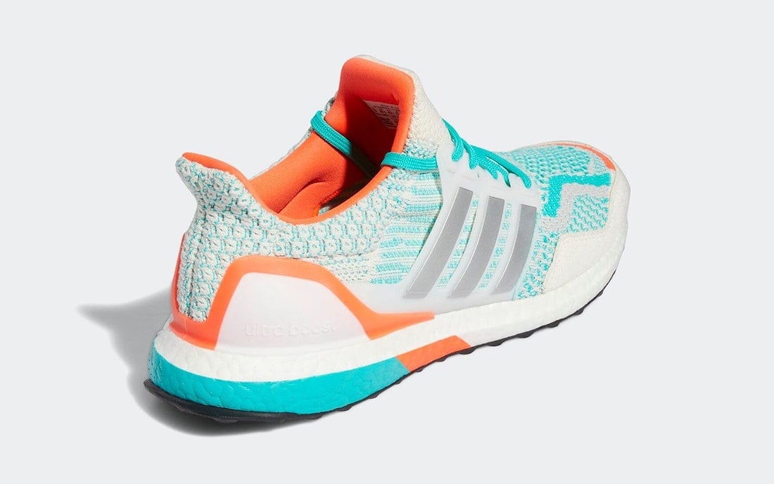 This adidas Ultra Boost features Miami Dolphins vibes while utilizing White Primeknit on the upper while Mint Green and Orange fill in the laces, inside of the tongue, liner, outlining the heel counter, and part of the White Boost midsole. Silver adorns the Three Stripes branding while a Black rubber outsole finishes the look.