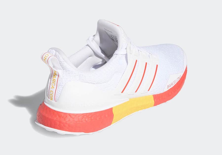 This adidas Ultra Boost comes with White Primeknit across the upper while the same shade covers the lace cage and heel counter. Following we have Red and Yellow detailing which lands on the Boost midsole and tongue while Red fills in the Three Stripes branding. Finishing the look is โBarcelonaโ on the lateral forefoot.