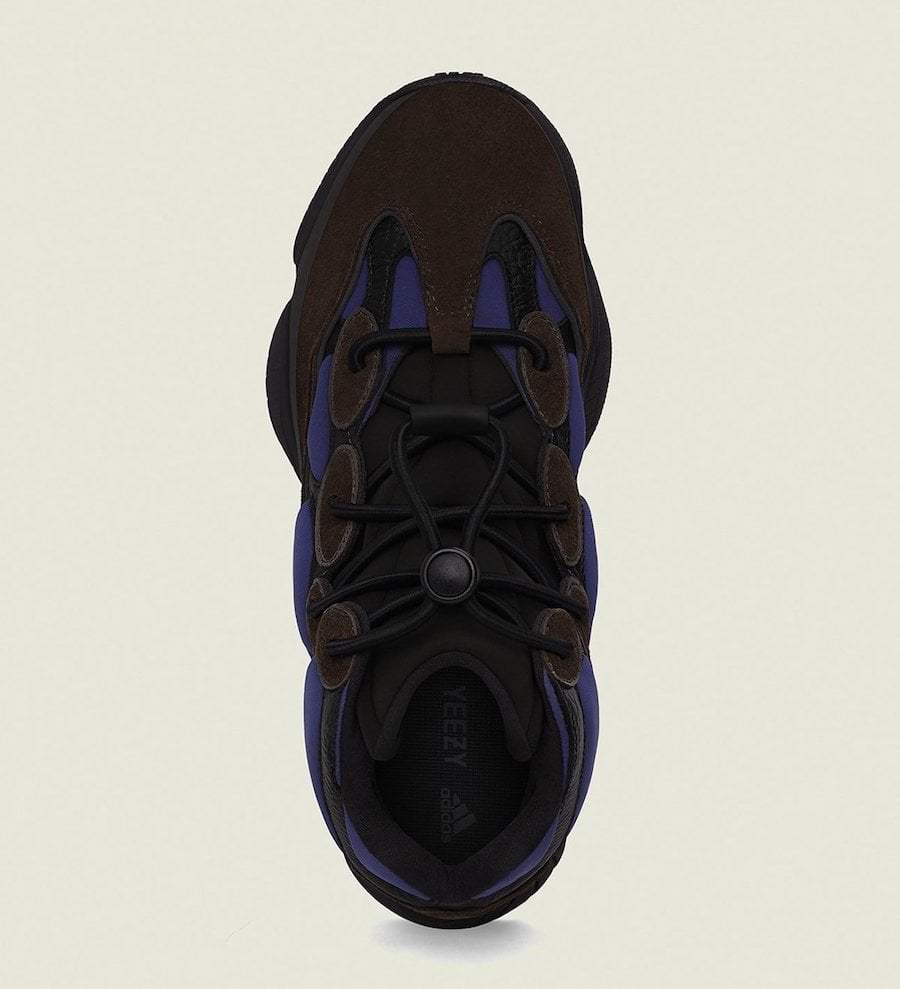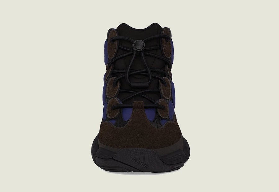 Looking closer this adidas Yeezy 500 High features a Blue neoprene base while Black tumbled leather and Brown suede covers the overlays. Following we have Black neoprene on the tongue, toggle lacing system while Charcoal covers the rubber outsole to complete the look.