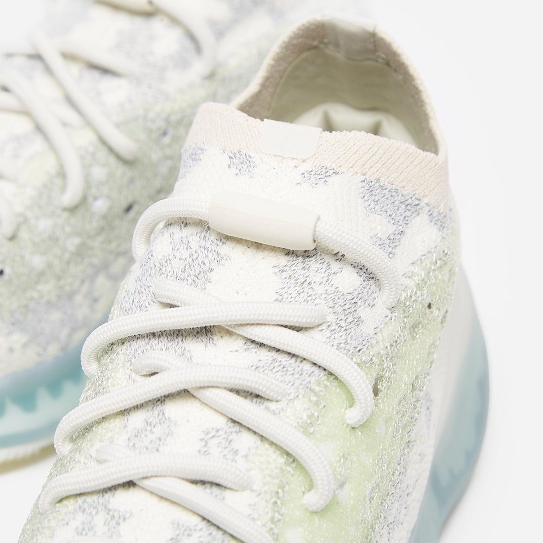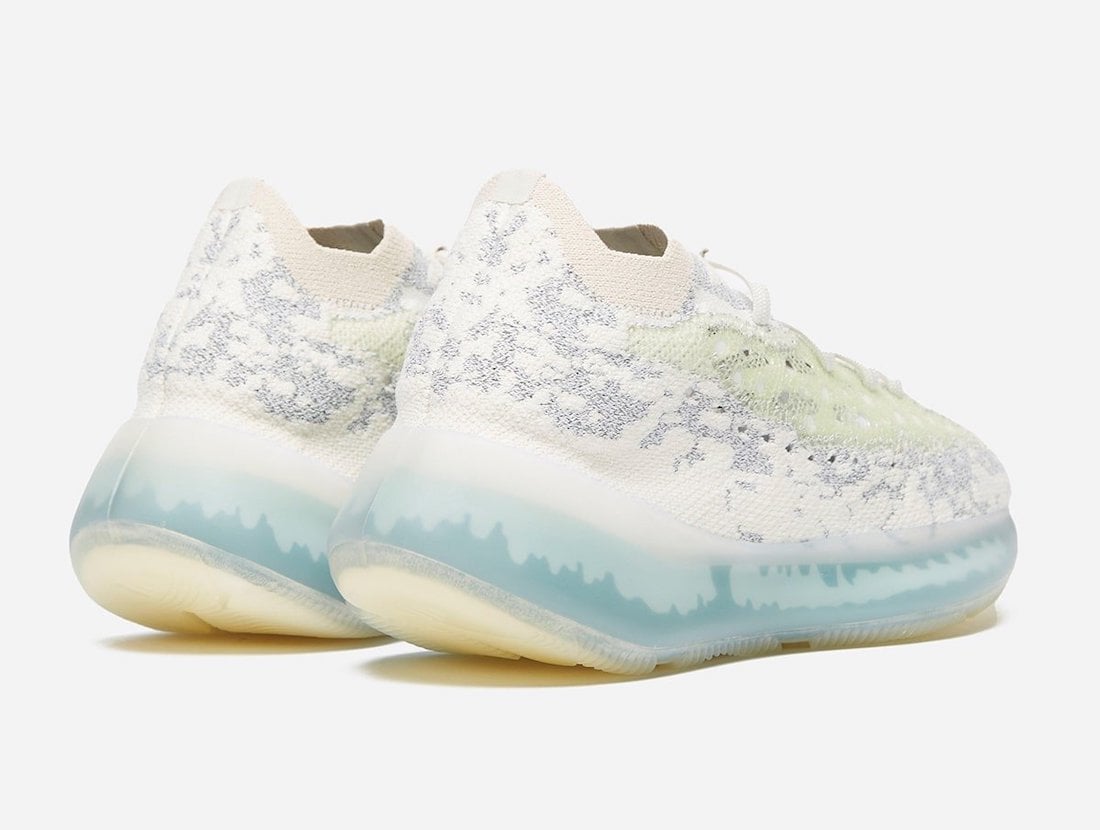 Looking closer, this adidas Yeezy Boost 380 comes with a mixture of Light Grey and White Primeknit across the upper. Next, they feature Green across the side stripe along with the traditional perforations. Lastly, a Blue icy translucent midsole and a translucent outsole finish the look.