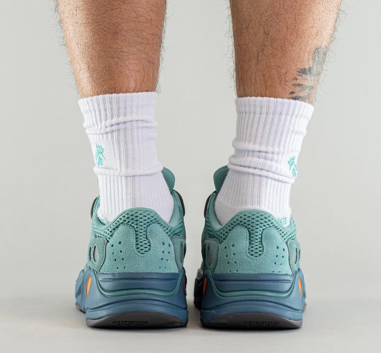 The color used on this adidas Yeezy Boost 700 is called โFADAZU,โ which more than likely is an abbreviation for Faded Azure. Looking closer, the pair features both dark and light teal throughout while constructed with mesh, leather, and suede. Next, Blue mesh appears on the panels that extend across the toe. Reflective accents hit the upper while a Grey/Blue hue covers the midsole. Lastly, Orange details and a Charcoal Grey rubber outsole finish the look.