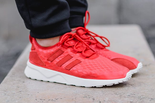 Known as the adidas ZX Flux Adv Verve, the two first color schemes are ‘Lush Red’ and ‘Off-White’. The heel cage and material on the uppers have been upgraded. The three stripes branding on the side matches the same material used on the heel counter. Each pair will then come with the standard ZX Flux midsole that is dipped in white.
