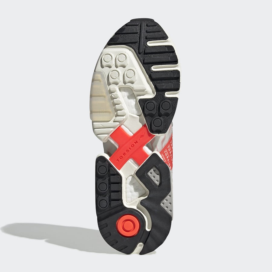 Dressed in a Footwear White, Crystal White and Solar Red color combination. Utilizing mesh and suede on the upper along with a zig-zag pattern on the translucent panels and heel. Following we have Solar Red detailing and repeated Torsion branding on the medial side.