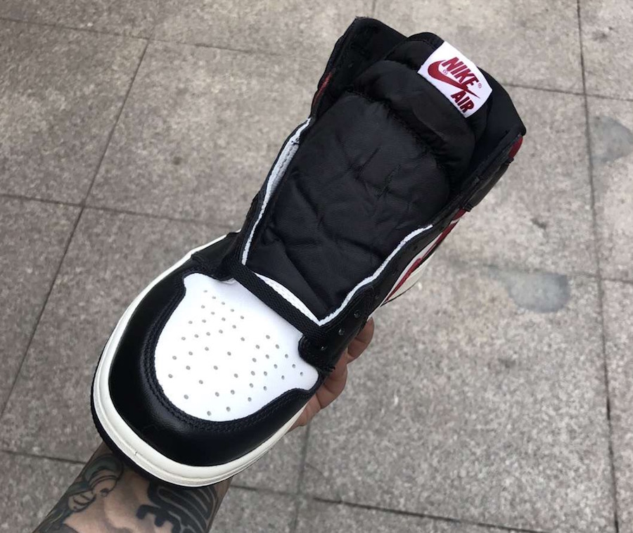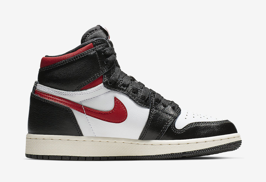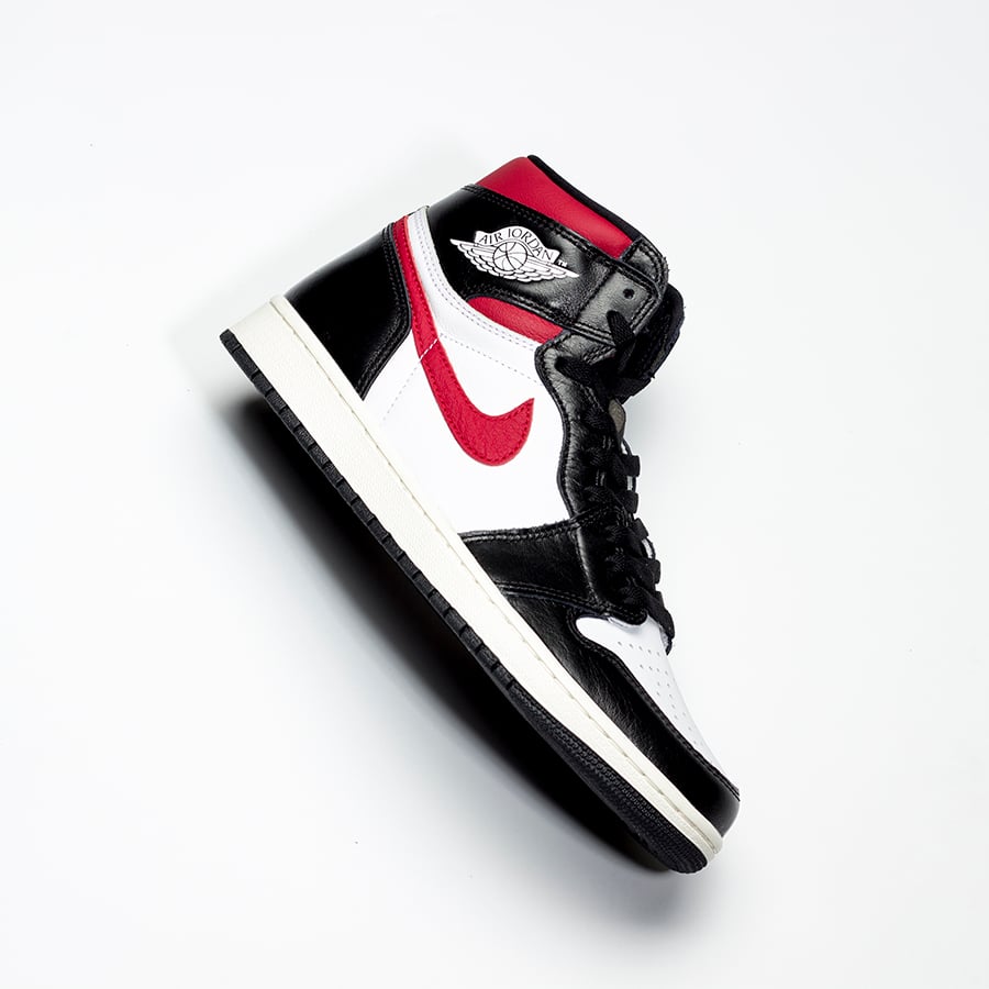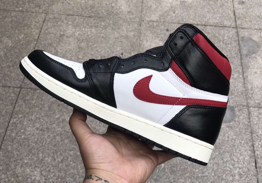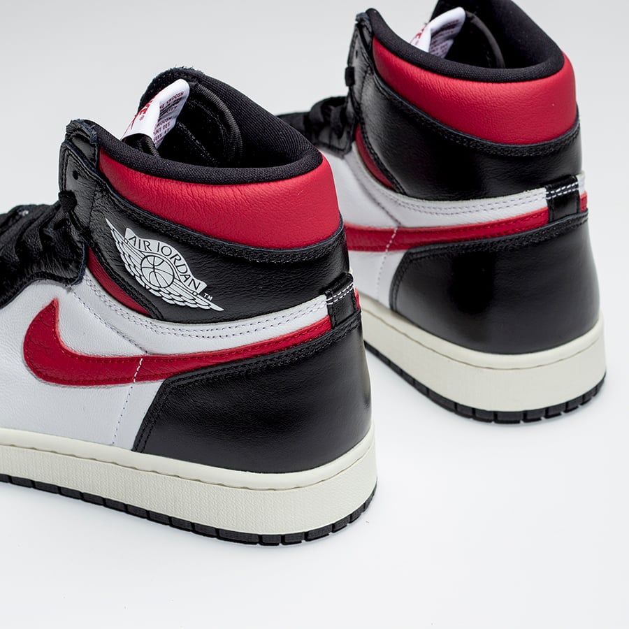 Looking closer this Air Jordan 1 comes dressed in a Black, White, Sail and Gym Red color combination. Highlighted with White leather on the panels and toe box while Black leather lands on the overlays. Following we have Red on the Nike Swoosh and collar. Other details includes Nike Air branding on the tongue, Sail on the midsole and a Black outsole.