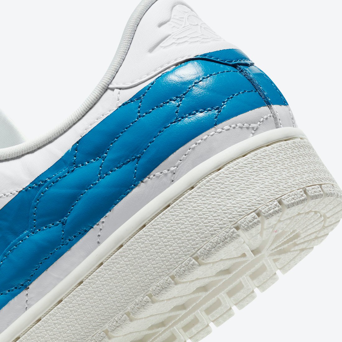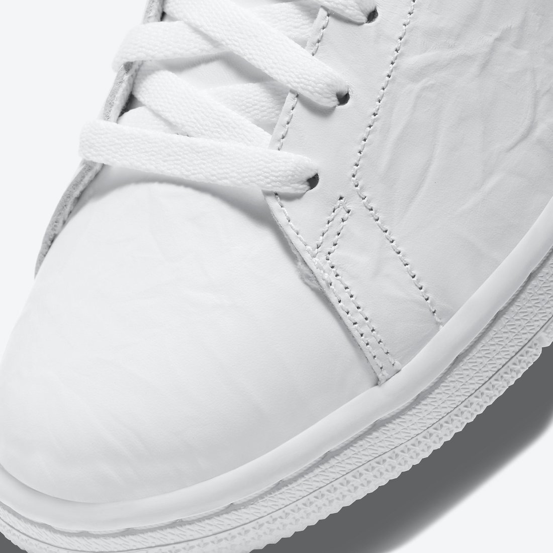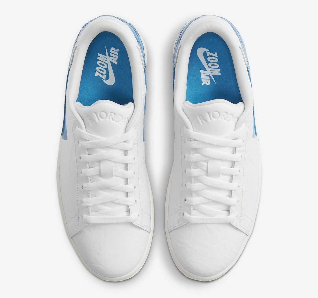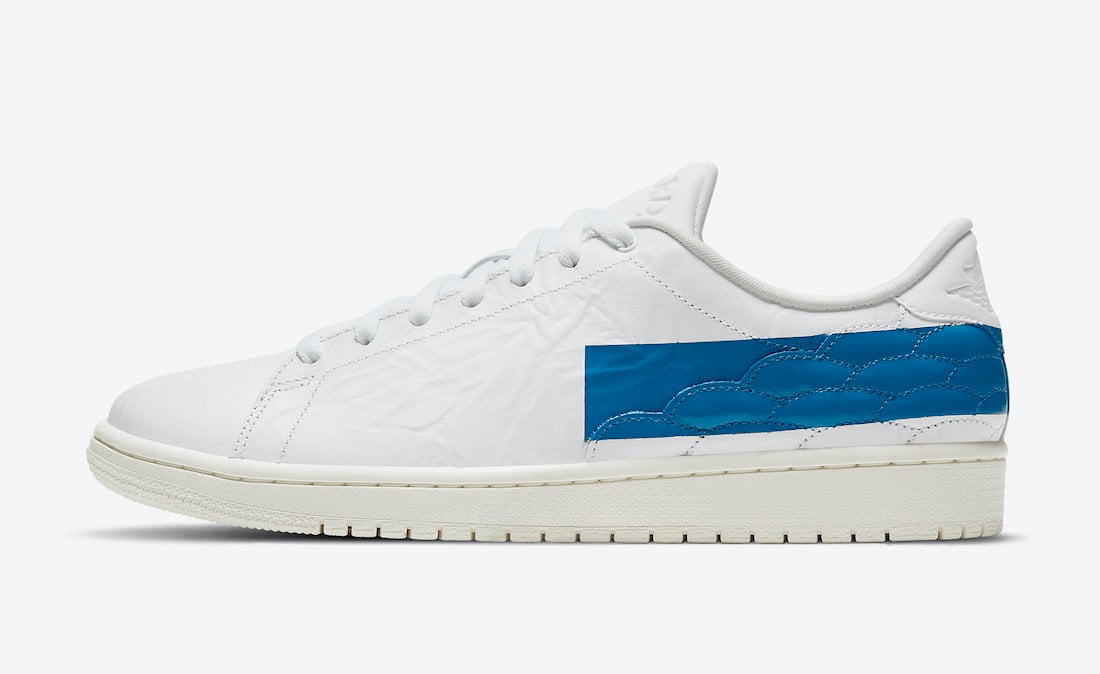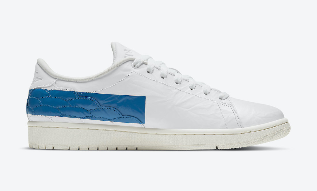 This Air Jordan 1 Centre Court comes dressed in a simple White, Military Blue, and Sail color combination. First, the pair features White crinkled leather across the upper while debossed branding lands on the tongue, and a stitched Wings logo covers the panels. Next, another Wings logo lands on the heel while a Military Blue racing stripe wraps it. Zoom Air branding adorns the Blue insoles, while a Sail midsole and matching rubber outsole finish the look.