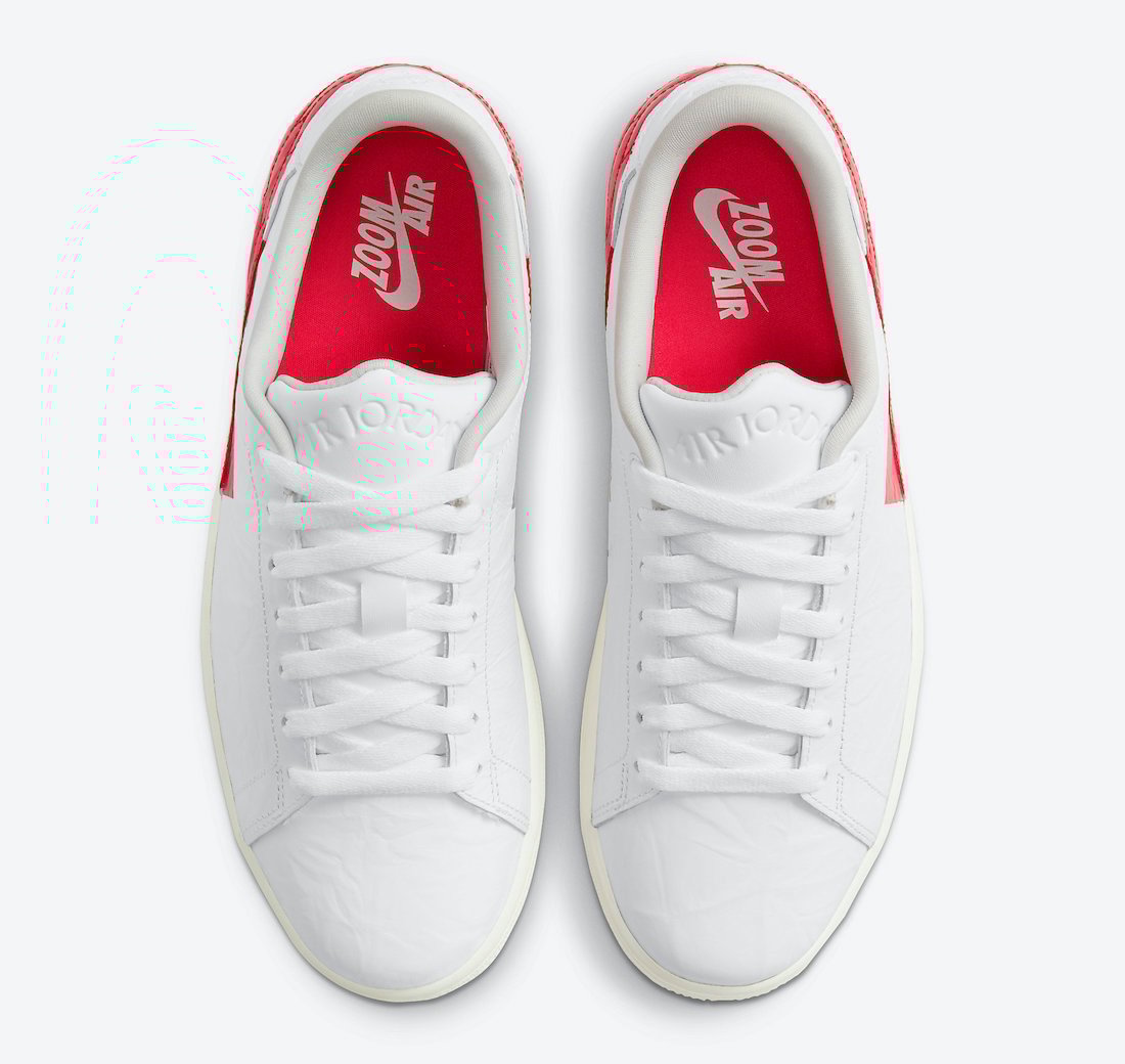 This Air Jordan Centre Court comes dressed in a White, University Red, and Sail color combination. First, the pair features White crinkled leather across the upper and debossed branding on the tongue and heel. Next, we have a bold Red racing stripe around the heel, while the same shade adorns the insoles with Zoom Air branding. Finally, a Sail midsole and matching rubber outsole finish the look.