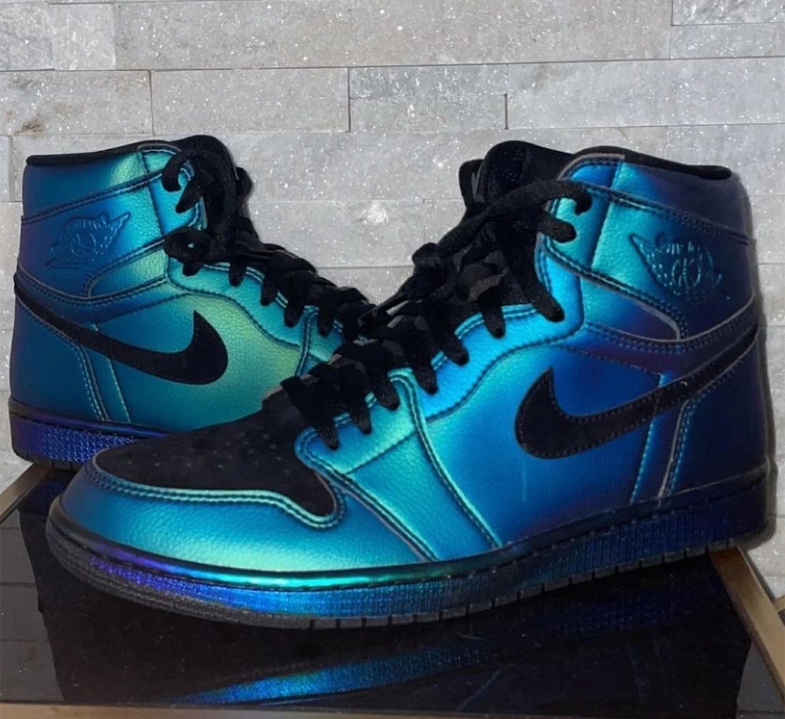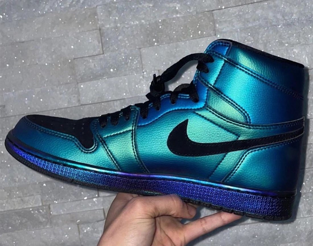 As you can see, this Air Jordan 1 features an iridescent upper that gradients from shades of Blue to Green. The look resembles the 2017 โAll-Starโ Air Jordan 1 and the Air Jordan 1 Zoom โFearlessโ that launched in 2019. Black suede lands on the toe box while the shade fills in the tongue, laces, Swoosh, and outsole to finish the look.