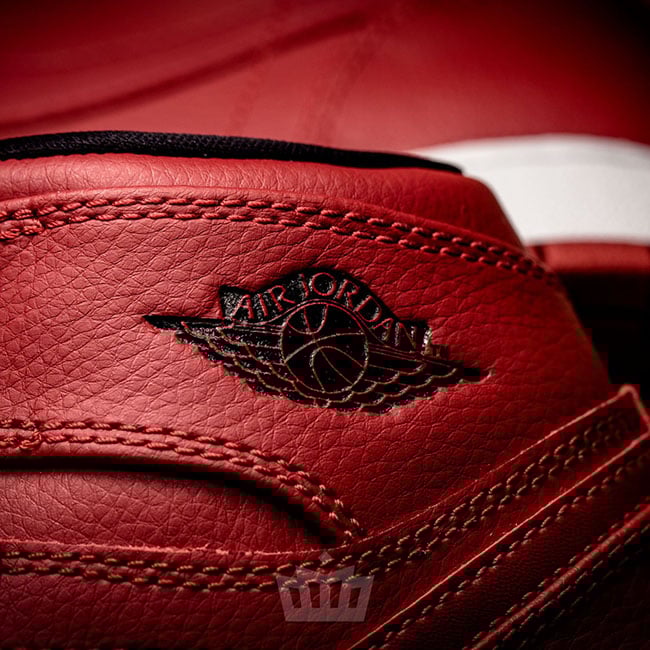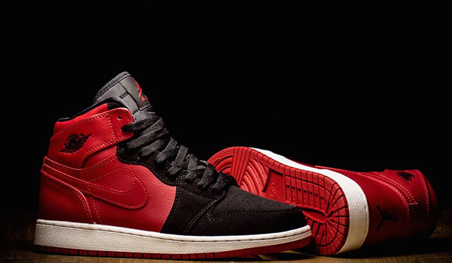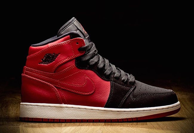 This Air Jordan 1 High is dressed in Black and Varsity Red. The Black will hit the toe box, run up the eyestays, tongue, liner and Wings logo. The Red will land on the panels, overlays by the heel and on the outsole. What is interesting is the material mashup which has the traditional leather but nubuck around and on the toe. The look is completed with White filling in the midsole.