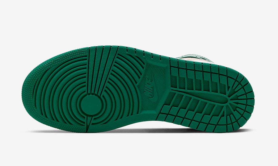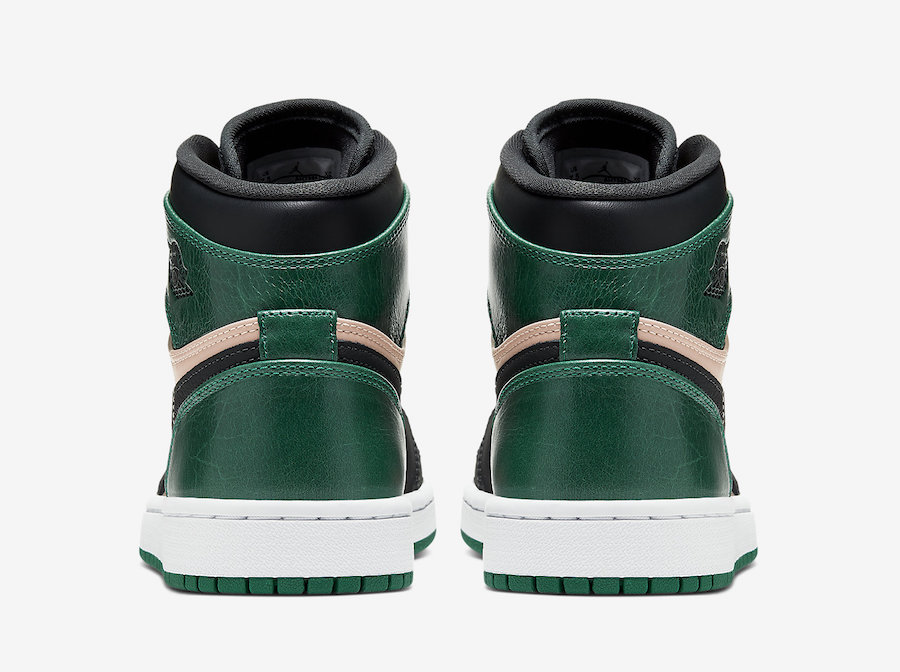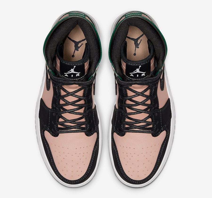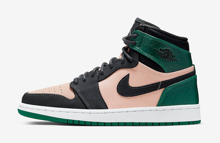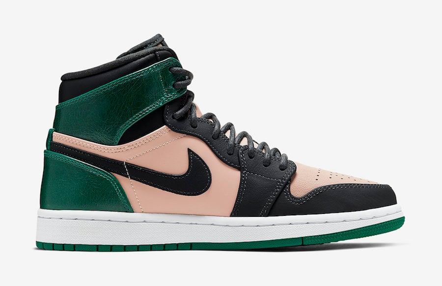 Looking closer this Air Jordan 1 features a shade of Pink across the leather base while Black leather lands on the overlays, eyestays and Swoosh logo. Highlighting this pair is Metallic Green cracked leather on the ankle overlay and across the heel. Other details includes a White midsole and Green rubber outsole.