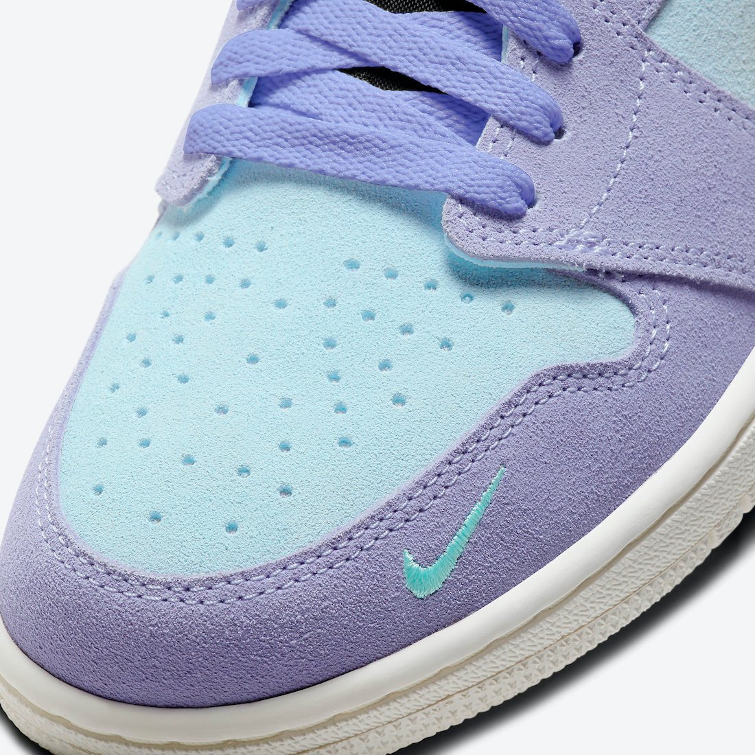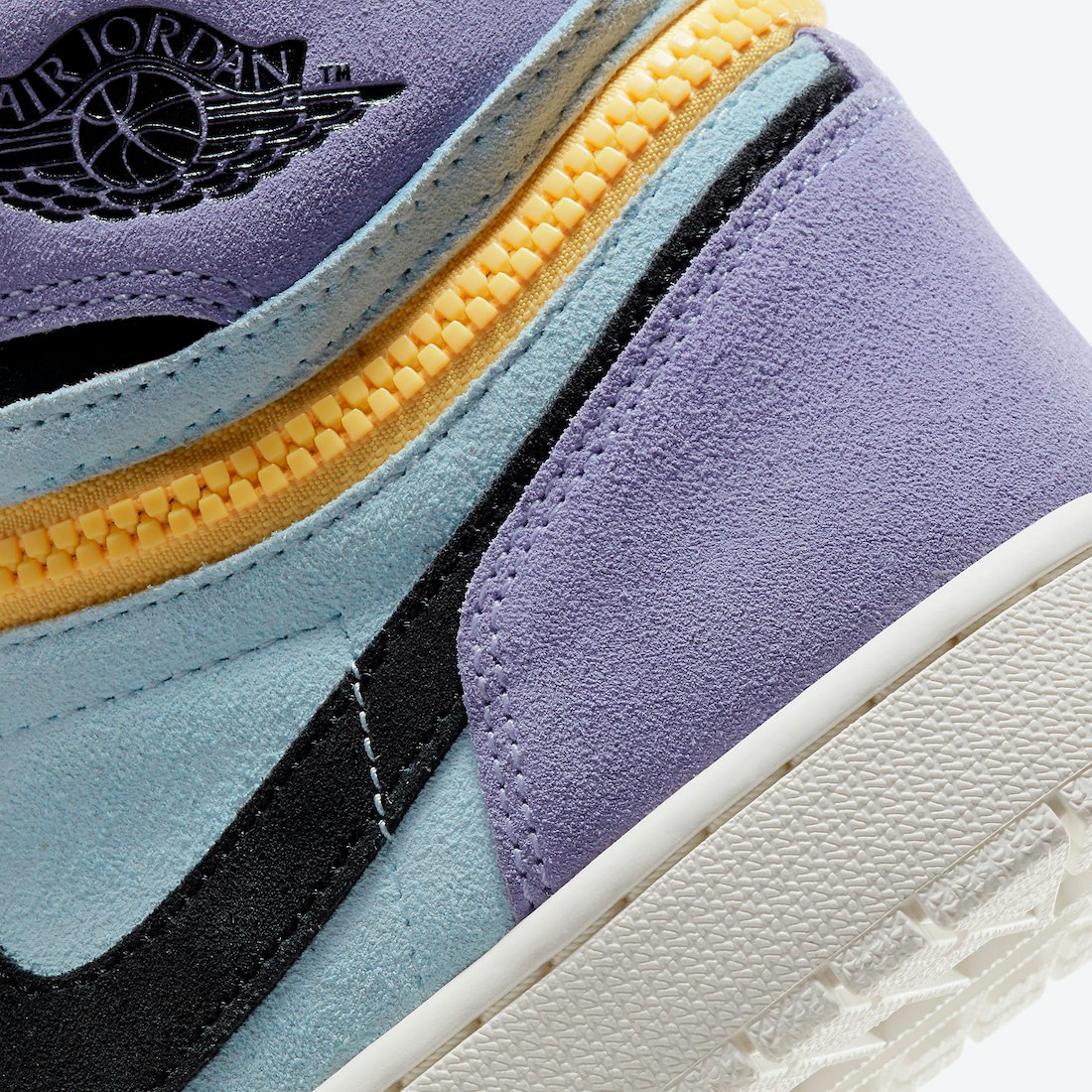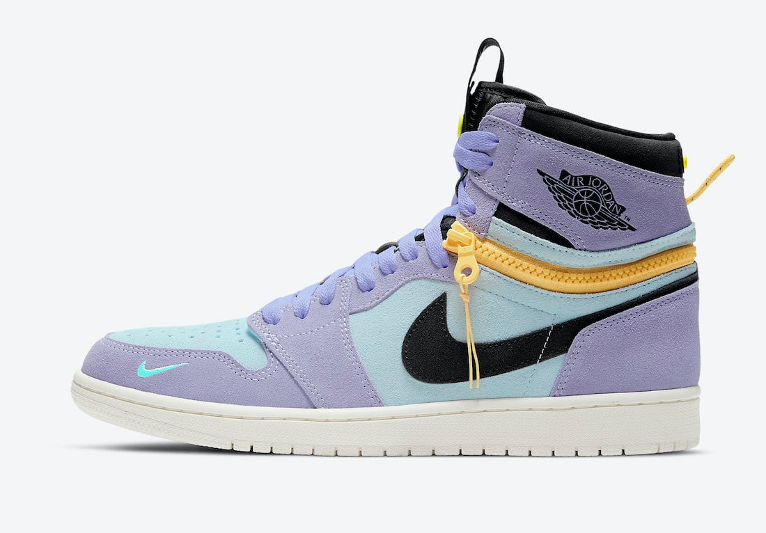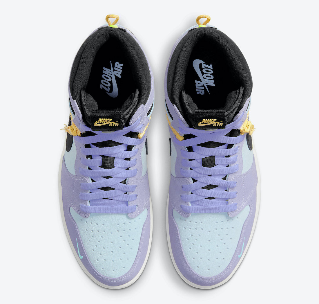 Looking closer, this pair comes dressed in a Purple Pulse, Glacier Blue, Sail, and Black color combination. Constructed with suede, Glacier Blue adorns the base, covers the two, and mini Swoosh on the toe. Furthermore, Purple appears on the ankle, heel, eyestay, and wraps the toe. Sticking out, Yellow runs across the zipper and heel pull tab while minimal accents of Volt hits the plugs. Following, Black details the Wings, ankle, and Swoosh across the panels. Lastly, we have Sail on the midsole and rubber outsole to finish the look.