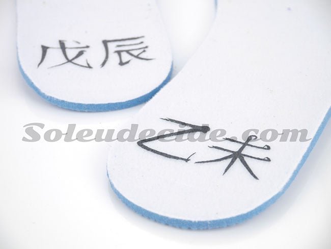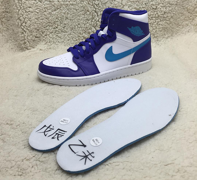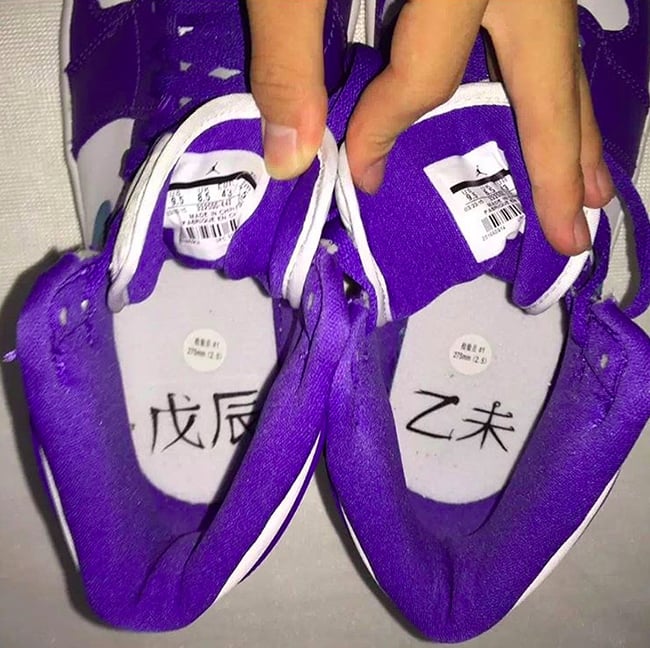 Using a white, purple and teal theme. The panels, around the collar and on the toe box is done in white. Following up is the use of purple which is seen around the toe cap, down the eyelets and overlays. Teal is then brought in to bless the swoosh, wings logo and Jumpman on the heel. On the insoles of the shoes is Chinese characters that translate to Wu Chen and Yi Wei.