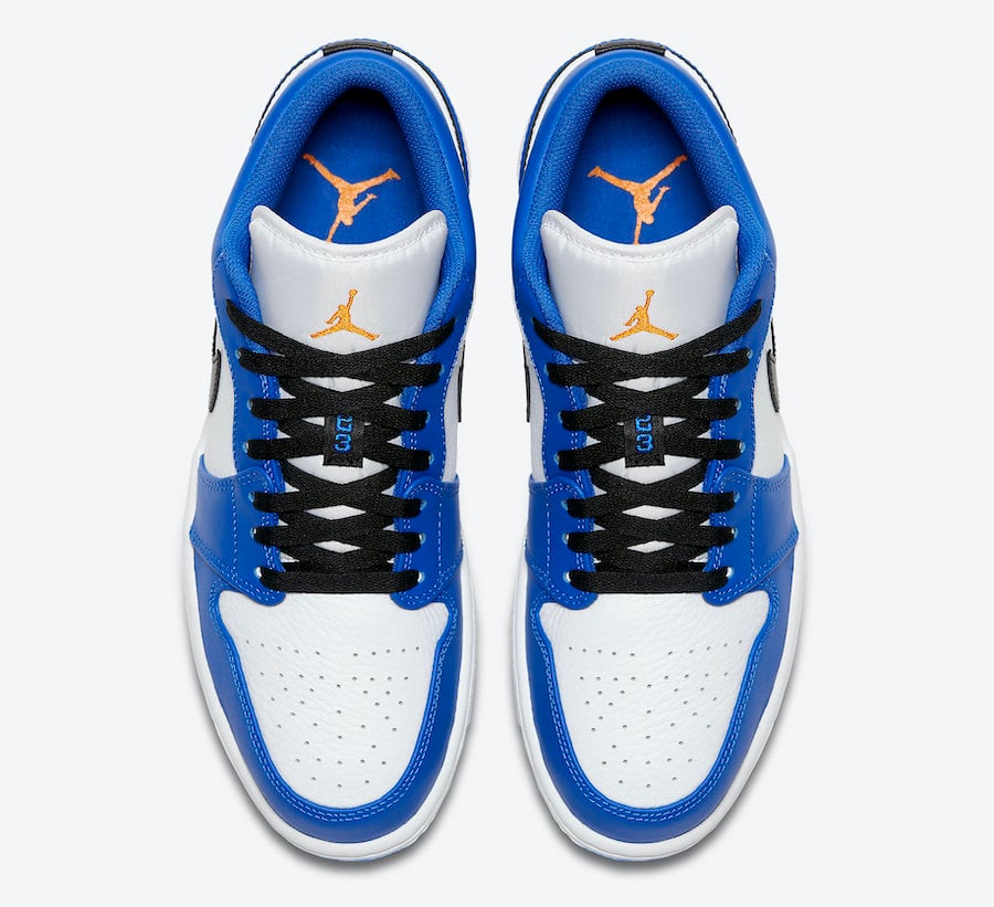 This low-top Air Jordan 1 comes with White leather across the base while Blue leather is applied to the overlays. Black is used on the Swoosh logo and laces while an Orange Jumpman is seen on the tongue and insole and the same shade lands on the embroidered Wings logo on the heel. Other details includes a White midsole and Blue rubber outsole.
