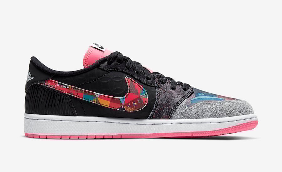 This Air Jordan 1 Low comes highlighted with Chinese graphics on the toe and side panels which includes embroidered roses on the medial Swoosh and on the toe of the right shoe. Pink runs across the tongue as well as on the lower part of the lateral eyestay and lace tips. Nike Air branding is placed on the tongue labels while a Black Wings logo on the heel finishes the look.