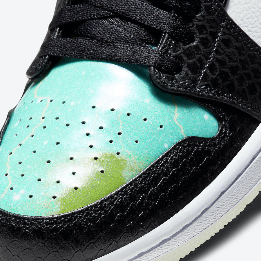 Looking closer it features White leather on the panels while Black snakeskin textured leather wraps the toe, mid-foot and eyestay. Following we have a galaxy inspired print on the Swoosh, wrapping the heel and ankle. Turquoise is applied to the toe with another graphic, splattered graphic lands on the insoles while a White midsole and glow in the dark outsole completes the look.