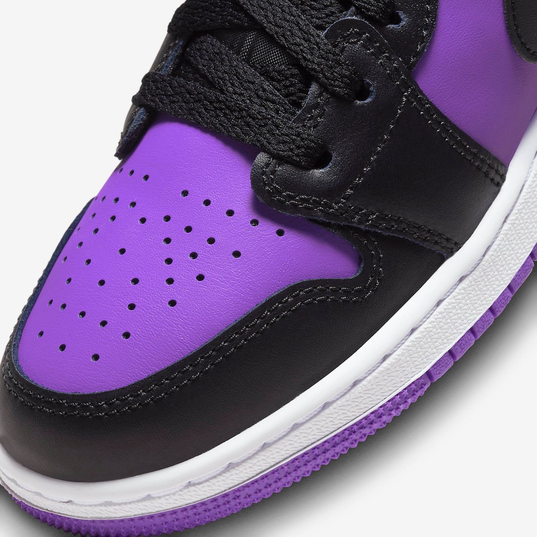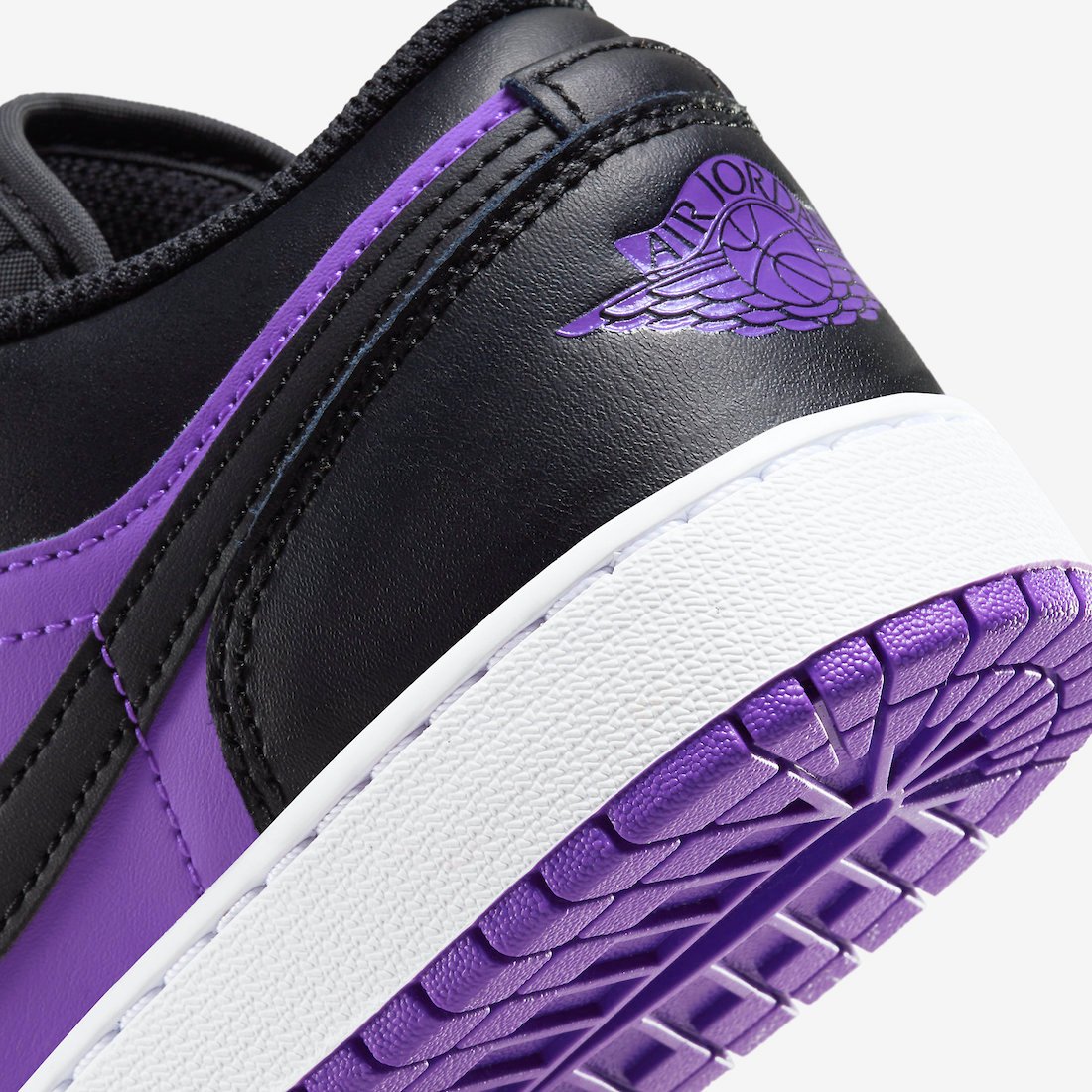 Featuring a sleek Black, Purple Venom, and White color combination. This Air Jordan 1 Low comes with the traditional leather build, while mesh drapes the tongues. Highlighting the shoes is the use of Purple across the toe cap, panels, tongue branding and overlay, Wings logo on the heel, and the rubber outsole. Black appears on the overlays, Swoosh logos, tongues, laces, and liner. Finishing the look is a White midsole.