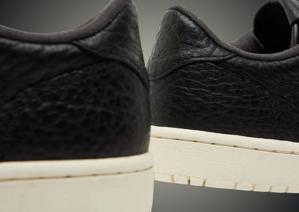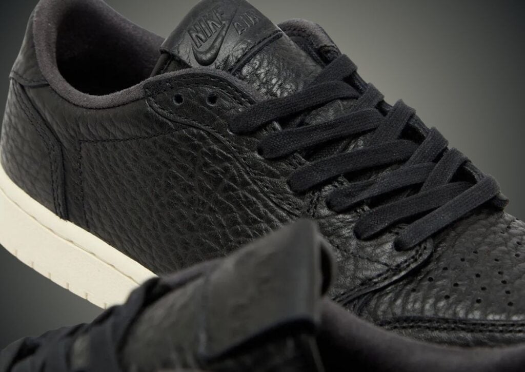 This Air Jordan 1 Low is dressed in a clean Black and Sail color combination. As you can see, the shoes are constructed with Black leather on the upper that is tumbled throughout. The same color and materials appear on the tongue and heel overlay. In addition, we have Nike Air branding on the tongue while the Wings logo is embossed on the heels. Along with Black laces, the look is completed with a Sail midsole and matching rubber outsole.