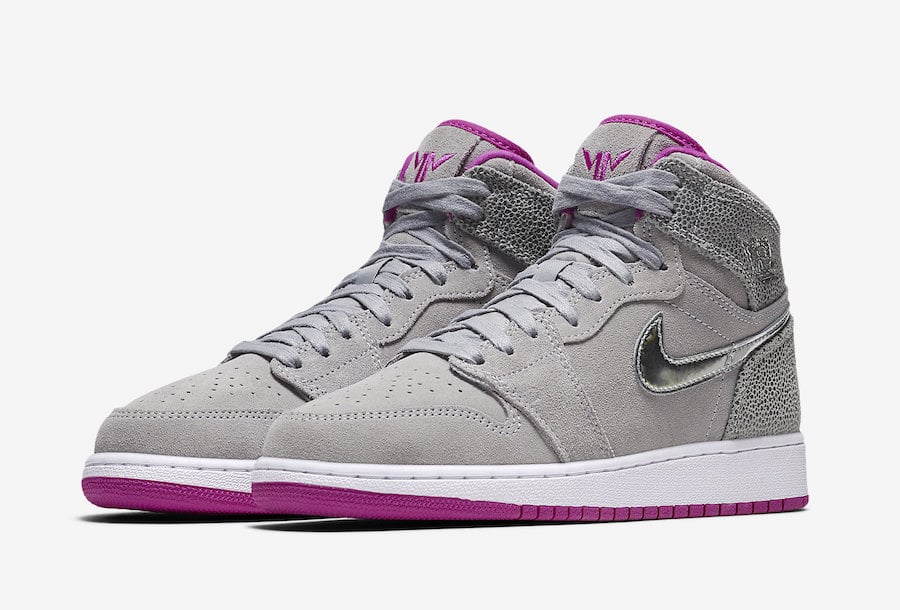 This Air Jordan 1 features a Wolf Grey, Metallic Silver and Fuchsia Flash color theme. Instead of the Jumpman branding on the tongue and heel, we have Mayaโs logo of โMMโ. Using Wolf Grey on the base, we have a textured print that wraps the heel. Following we have White on the midsole while Metallic Silver is applied to the Nike Swoosh. Finishing the look is Fuchsia Flash which accents the uppers and covers the outsole.