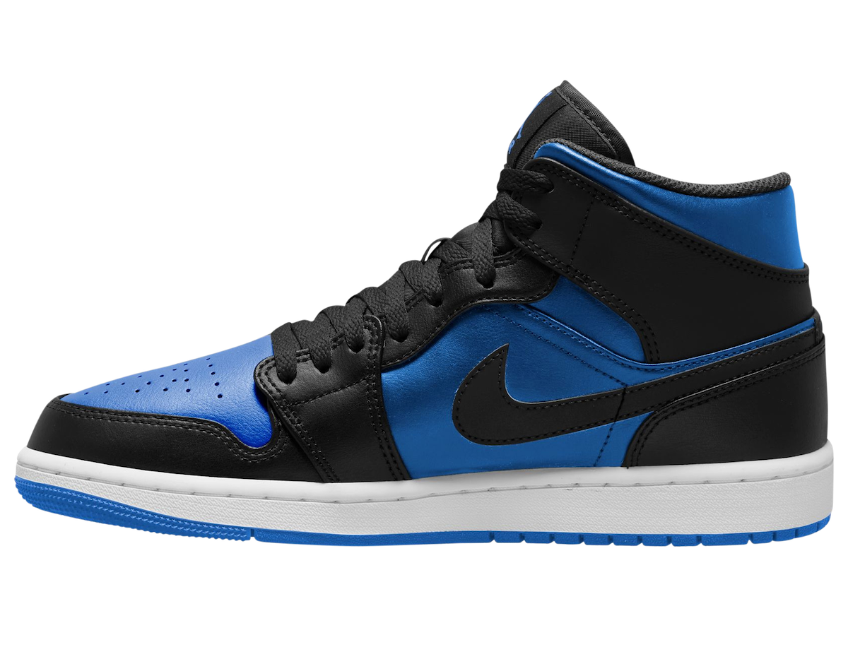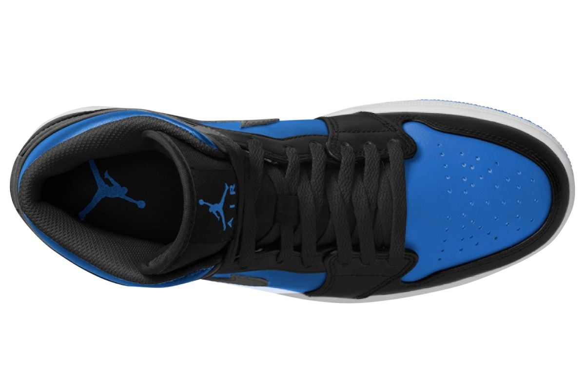 This Air Jordan 1 Mid features shades of Black, Royal Blue, and White. Constructed with the usual leather and mesh on the rogues. Royal Blue adorns the toe box, panels, collar, and Wings logo that features a metallic finish. Next, Black lands on the overlays, tongues, laces, and liner. More Royal Blue is used on the Jumpman logos and rubber outsole. Finishing the look is a White midsole.