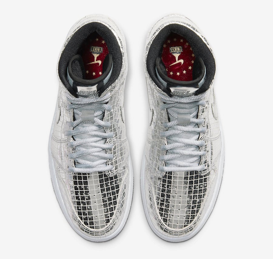 This mid-top edition of the Air Jordan 1 comes with a 1970s disco theme and will bring you back to the nightlife during that decade. Featuring a mirrored square-cut upper to resemble that of a disco ball. In addition we have Silver laces and mesh on the tongue. Following we have a Oscar inspired trophy on the insole with Red velvet while Black velvet covers the liner. This pair could also be inspired by the 92nd Academy Awards that will take place on February 9th.