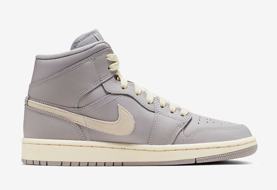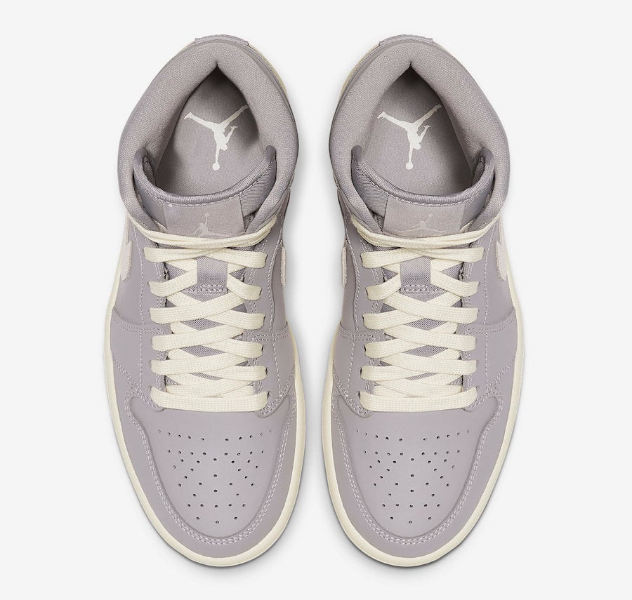 This mid top Air Jordan 1 features Grey across the upper which almost looks Purple. Constructed with leather, it features the traditional perforations across the toe. Light Bone then accents the Swoosh and Wings logo while a vintage like hue is placed on the laces, Swoosh logo and midsole. Finishing this pair is Grey used on the rubber outsole.