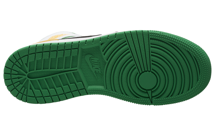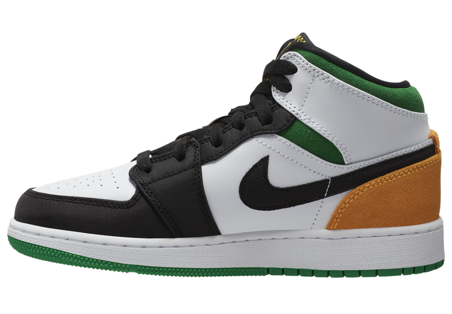 Looking closer this mid-top Air Jordan 1 comes dressed in a White, Laser Orange, Black and Lucky Green color combination which somewhat has a Seattle Supersonics vibe. Using White leather across the upper while Black lands on the overlays. Following we have Laser Orange and Lucky Green detailing on the suede that wraps the heel and ankle collars. Finishing the look is Laser Orange stitching and Jumpman on the tongue and a Green rubber outsole.