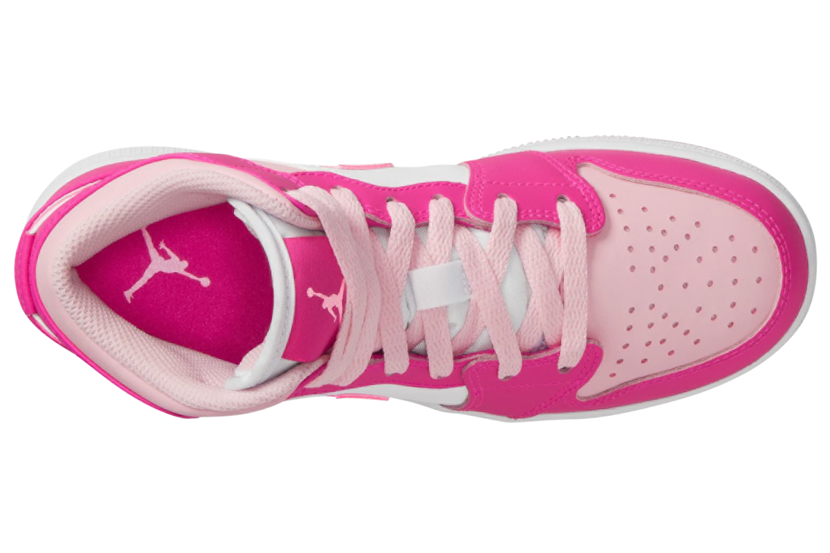 This Air Jordan 1 Mid comes dressed in a White, Medium Soft pink, and Fierce Pink color combination. Constructed with leather throughout and mesh on the tongues. Next, we have shades of light and dark Pink on the overlays, laces, Swoosh logos, collar, and ankle. White then fills in the base, tongues, and midsole. Other details include Pink on the branding and the rubber outsole.