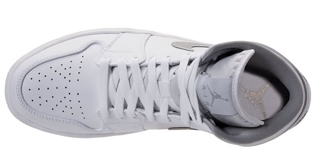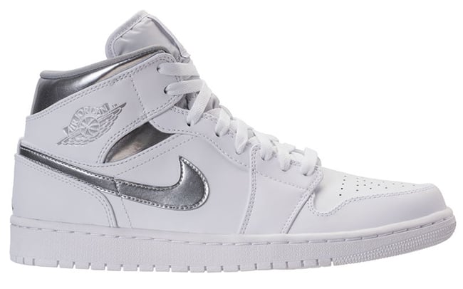 This mid top Air Jordan 1 comes dressed in a White and Metallic Silver color combination. Across the base we have White leather which extends across the perforated tongue. Metallic Silver then lands on the Nike Swoosh, Wings branding, around the collar, Jumpman on the heel and insole. Finishing the look is White on the midsole and outsole.