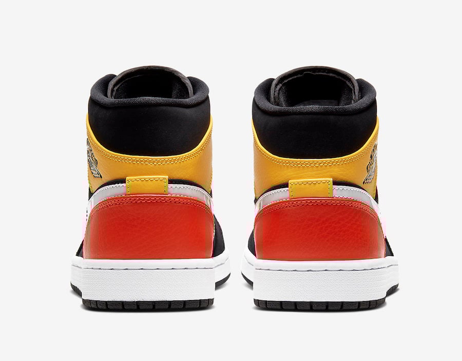 Featuring a Black, Amarillo, White and Team Orange color combination. Looking closer this mid-top Air Jordan 1 comes with Black nubuck across the base while Orange leather covers the toe and wraps the heel. Yellow leather then takes over the eyestays and ankle. Other details includes White on the Swoosh logo and midsole while a Black rubber outsole completes the look.