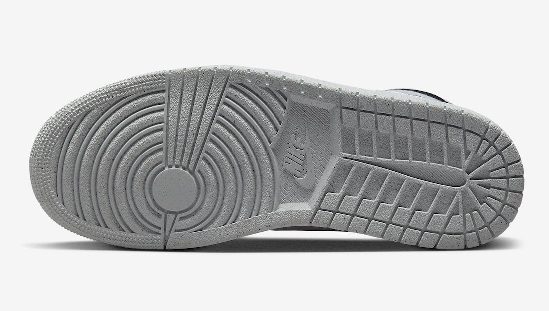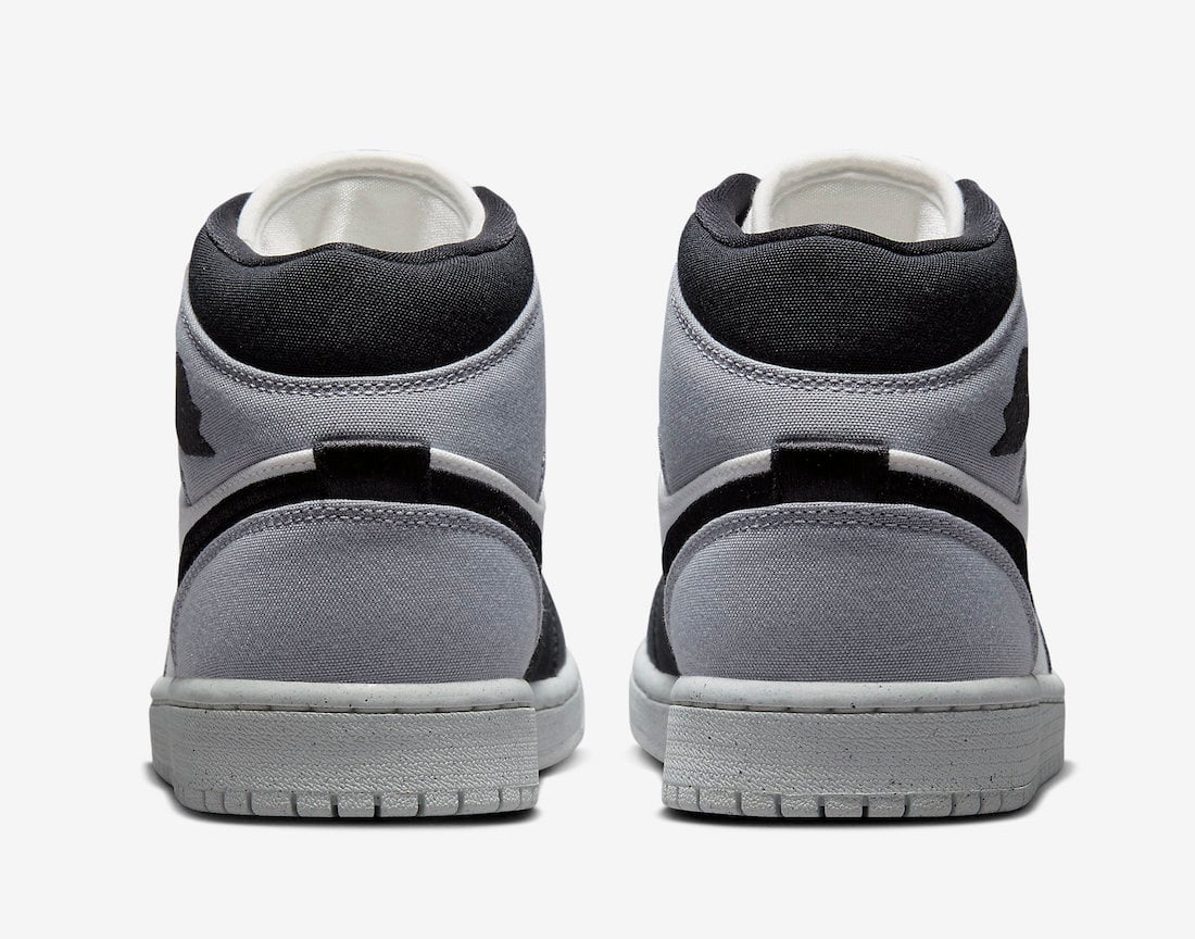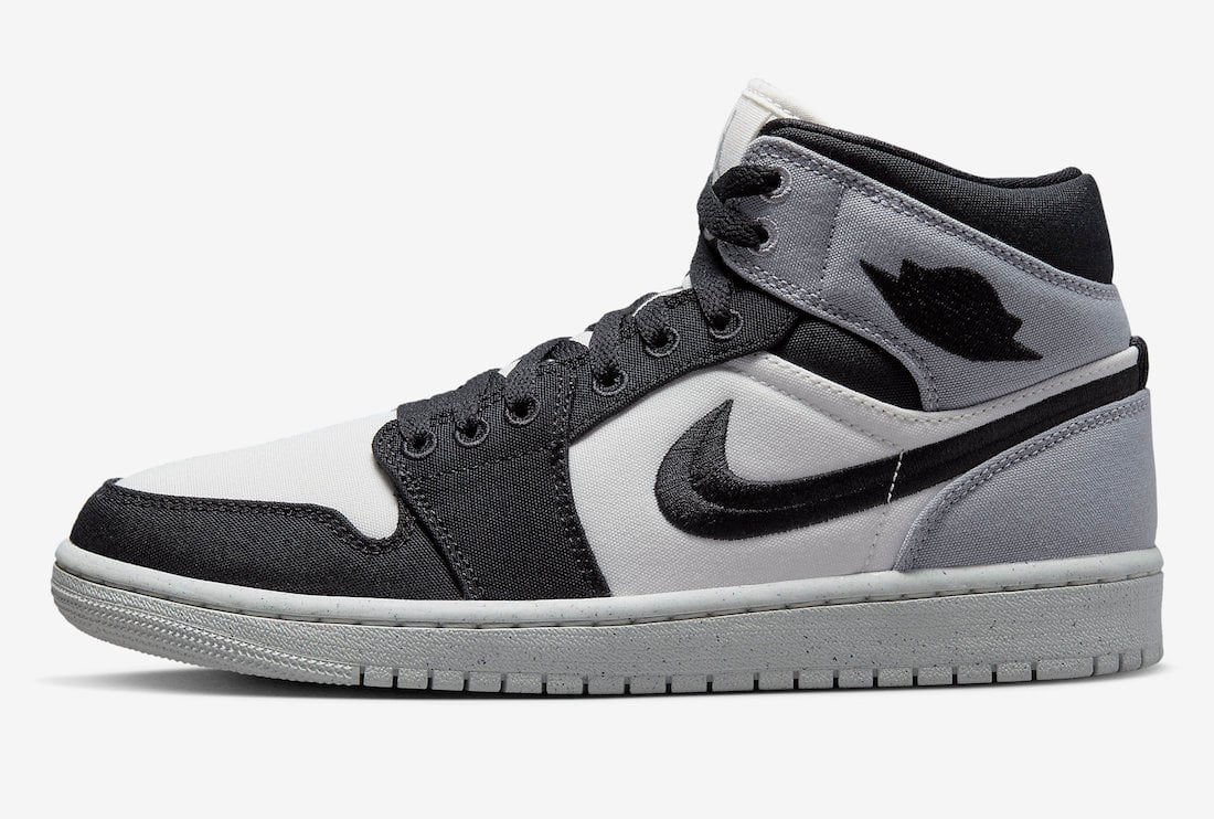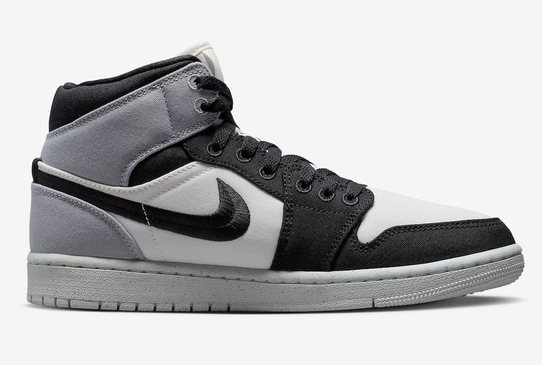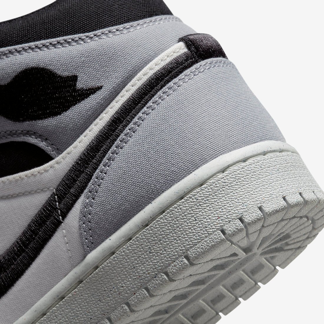 Going over this Air Jordan 1 Mid, it comes dressed in a Sail, Black, and Light Steel Grey color combination. Constructed with canvas throughout and embroidered Swoosh logos on the panels. Black wraps the toe, eyestays, laces, Swoosh, ankle, and Wings logo, and Light Steel Grey wraps the heel and appears on the ankle. Lastly, a Sail speckled midsole and matching rubber outsole finish the look.