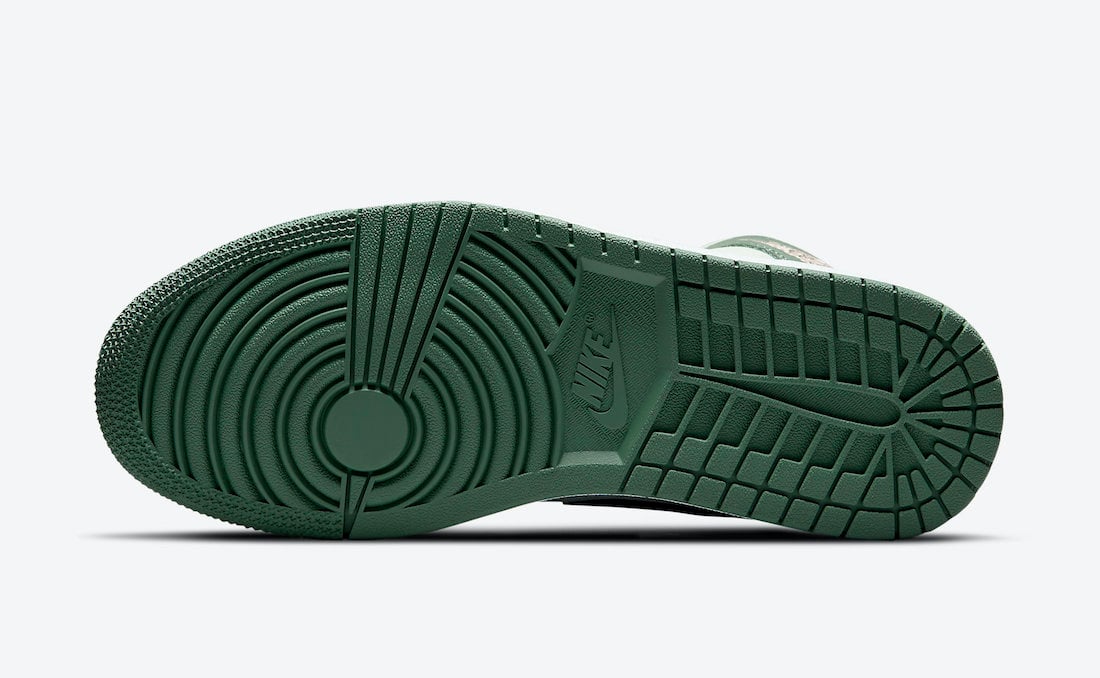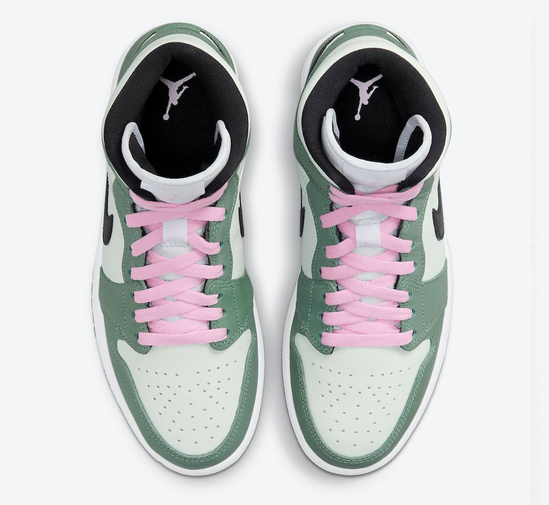 Looking closer, this mid-top Air Jordan 1 features a Dutch Green, Black, and Barely Green color combination. Featuring Barely Green leather on the upper while Dutch Green adorns the overlays. Next, Black leather adorns the Swoosh logos on the panels while Pink runs across the laces, tongue and insole branding, and Wings. Lastly, a White midsole and a Green rubber outsole finish the look.