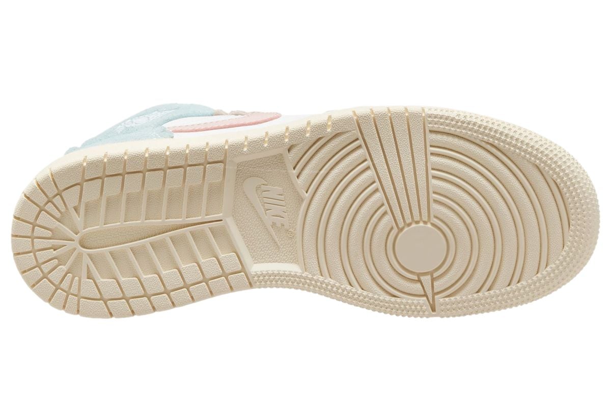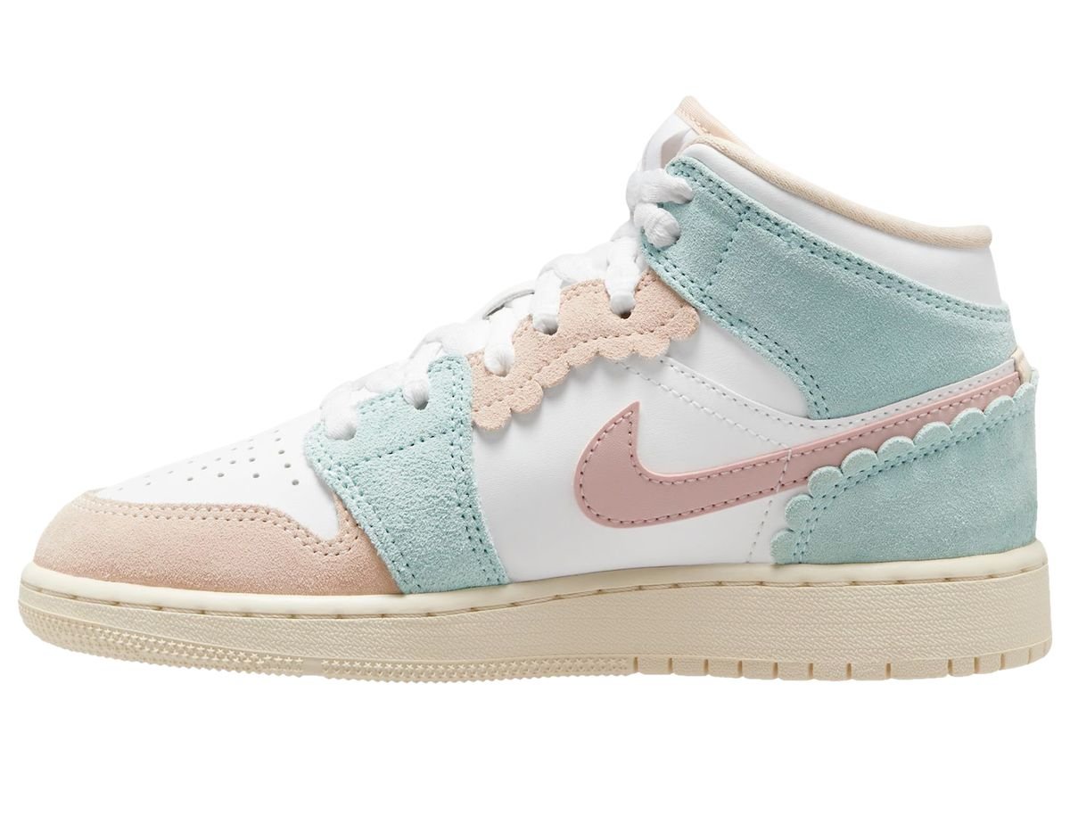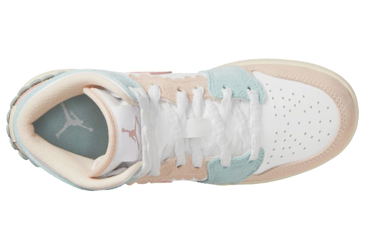 This mid-top Air Jordan 1 combines a White, Pink Oxford, Jade Ice, and Guava Ice color scheme. Constructed with a White leather base, suede adorns the overlays in pastel shades and scalloped edges. Other details include a debossed Wings logo on the ankle and a Coconut Milk rubber sole.