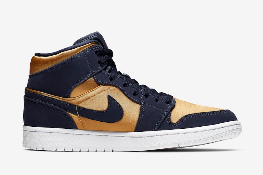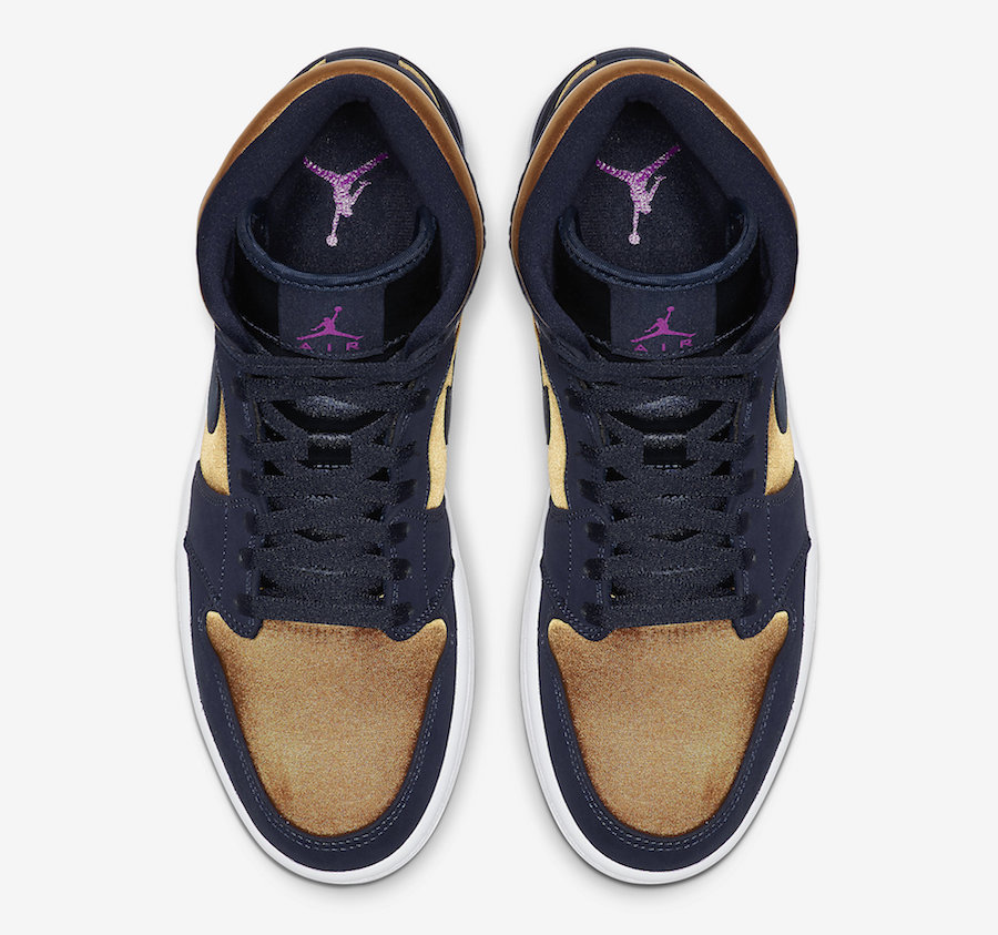 This Air Jordan 1 comes dressed in a Strain Gold, Obsidian and White color combination. Highlighted with Obsidian nubuck on the overlay, they also have Gold satin on the panels, toe and on the ankle collar for a luxurious feel. Fuchsia is placed on the Jumpman on the tongue and insole while a White midsole and rubber outsole completes the look.