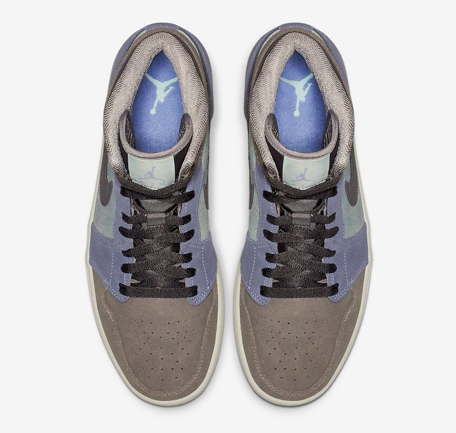 This Air Jordan 1 comes dressed in a Grey, Blue and Sea Green color combination. Looking closer we have Black on the ankle collar, tongues, laces and Nike Swoosh while Green lands on the panels. Following we have a Blue suede on the overlays around the heel and eyestays while Sail covers the midsole and outsole to complete the look.