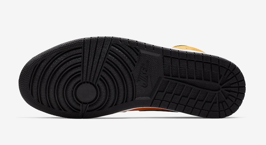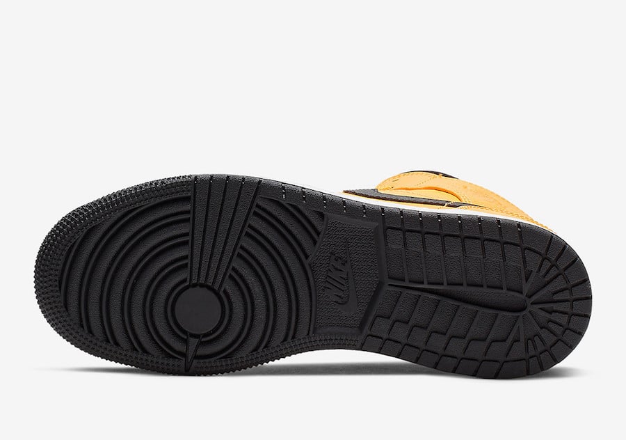 Looking closer this Air Jordan 1 features Yellow tumbled leather across the upper while Black leather lands on the Swoosh logos, nylon tongue and liner. Following we have White on the tongue label and across the midsole while Black covers the outsole to complete the look.
