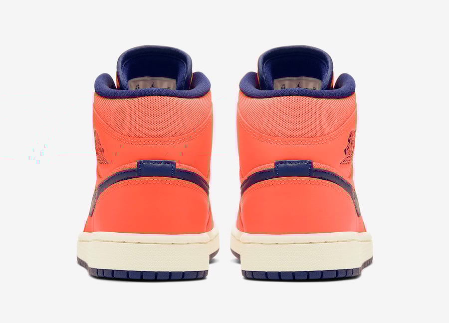Specifically, this mid top Air Jordan 1 features a Turf Orange and Blue Void color combination. Turf Orange covers the upper while constructed with leather and mesh. Following we have Blue Void placed on the Swoosh logo on the panels, tongue label, Wings branding, liner and rubber outsole. Completing the look is Sail used across the midsole.