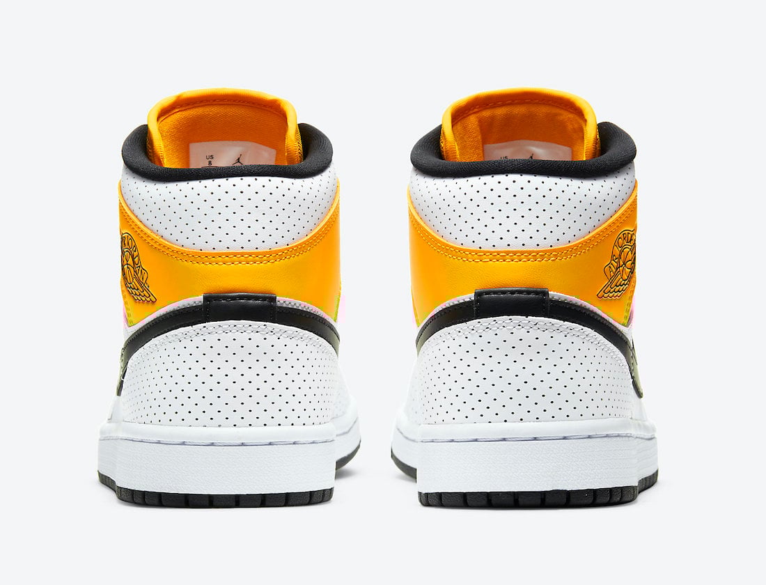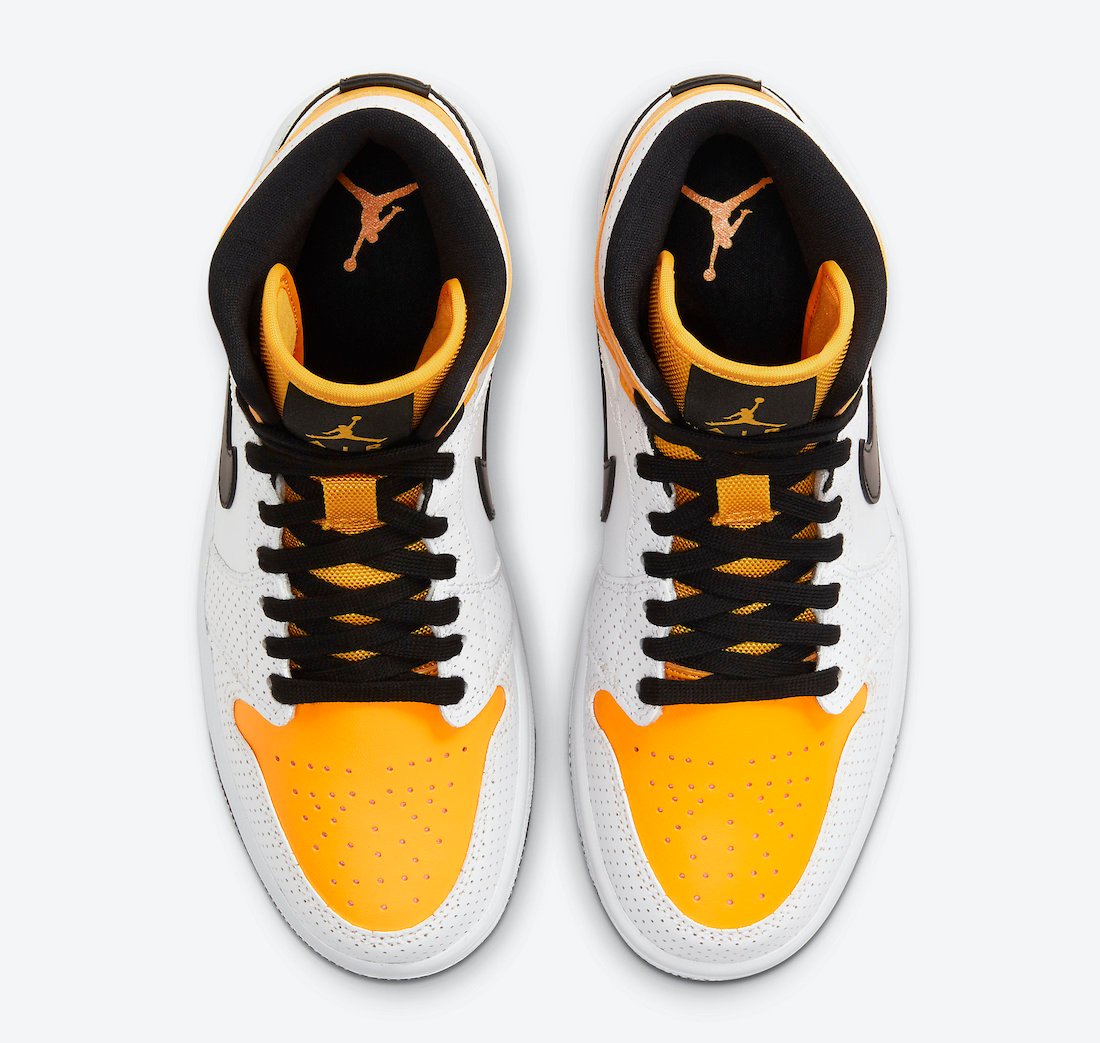 Looking closer, this mid-top Air Jordan 1 comes constructed with White leather on the panels while perforated leather covers the overlays. Furthermore, University Gold lands on the toe, tongue, and ankle overlay. Black then adorns the Swoosh, tongue label, liner, laces, and rubber outsole. Finally, a White midsole finishes the look.
