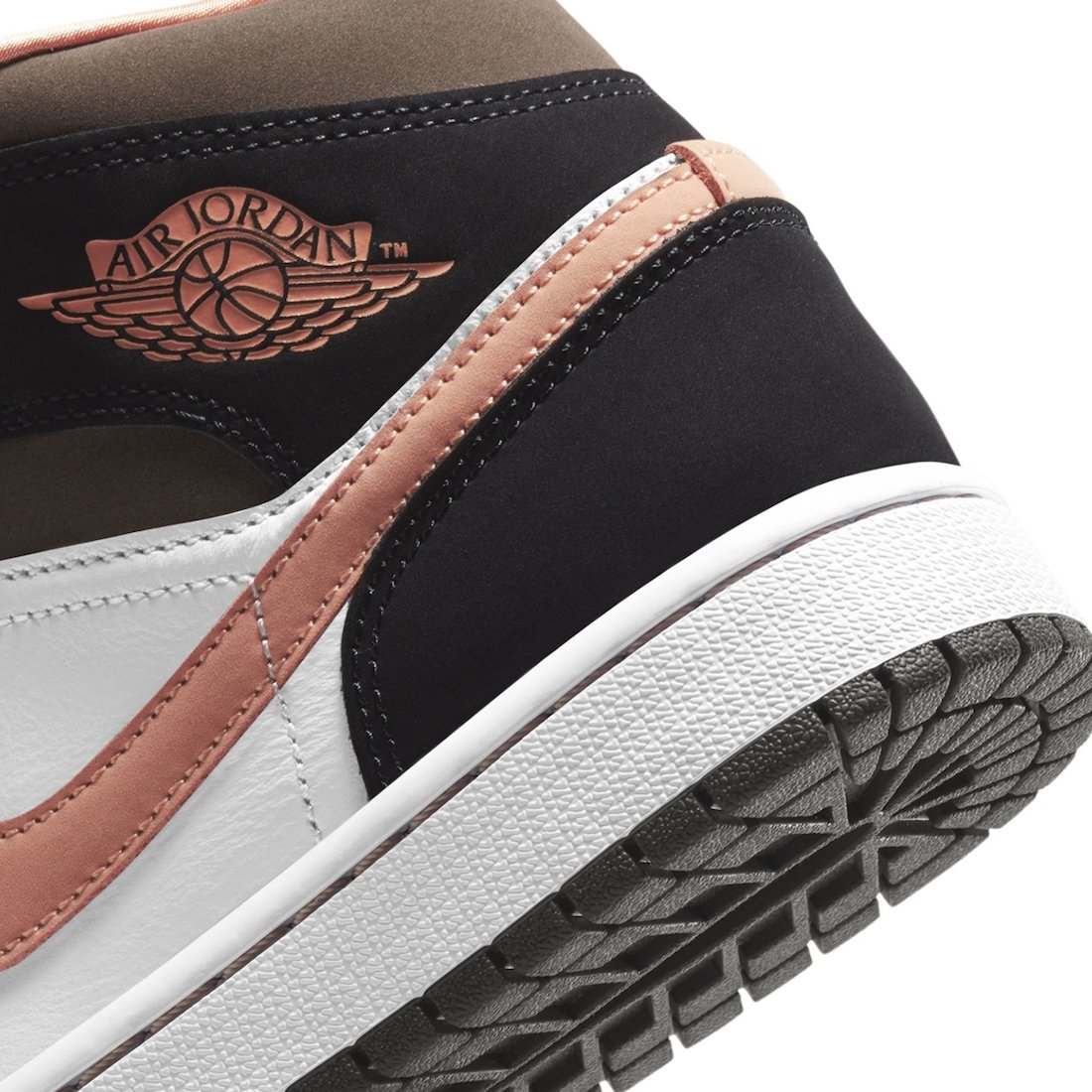 Looking closer, this mid-top Air Jordan 1 features White leather across the base while Black suede adorns the overlays, eyestay, toe cap, ankle overlay, and heel counter. Furthermore, a light shade of Oink hits the Wings, Swoosh logo, laces, and liner. Lastly, a White midsole and a Black rubber outsole finish the look.
