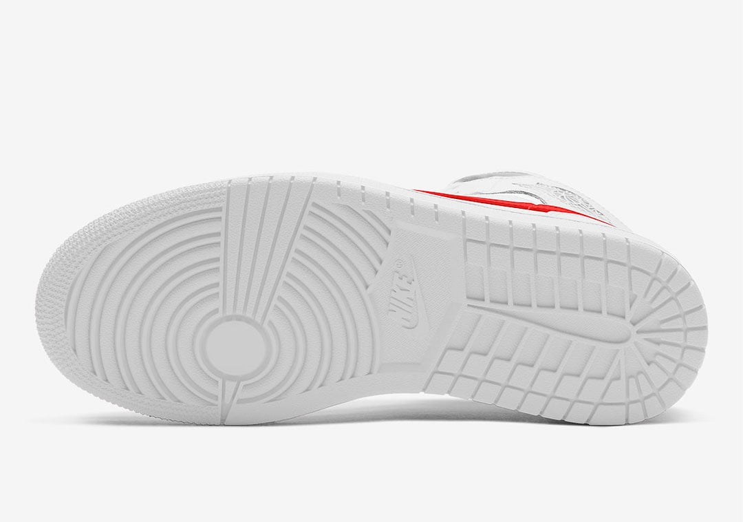 Looking closer this mid-top Air Jordan 1 comes with White leather throughout while the same shade lands on the mesh tongue, midsole and rubber outsole. In addition we have perforations on the toe while University Red is applied to the Swoosh logos, Jumpman on the tongue and Wings logo to finish the look.