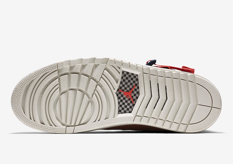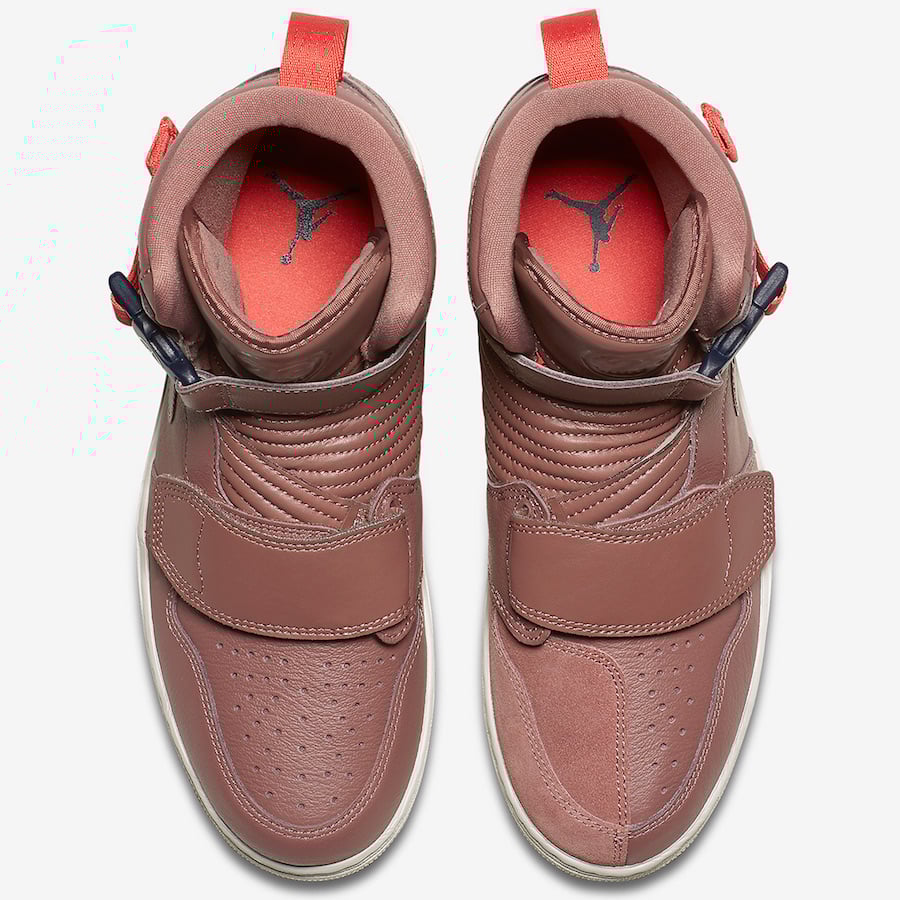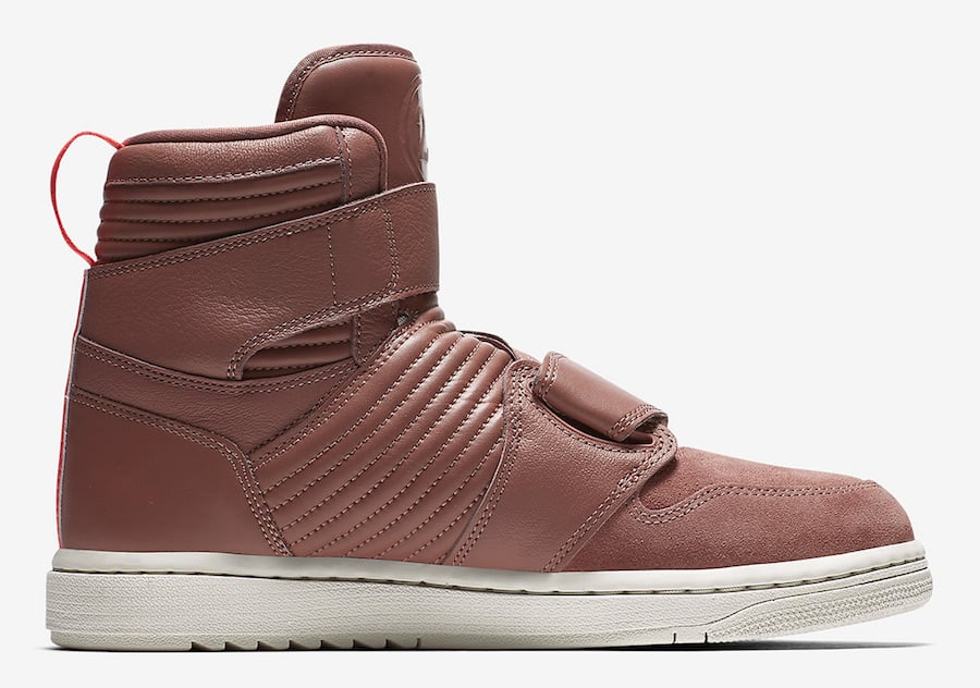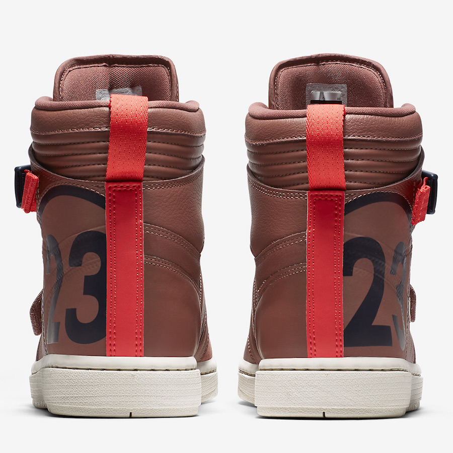This Air Jordan 1 comes dressed in a Smokey Mauve, Ember Glow, Light Bone and Obsidian color combination. Looking closer it features an extended collar along with straps that resembles a leather racing jacket. The number 23 is placed on the heel while a carbon fiber plate on the outsole completes the look.