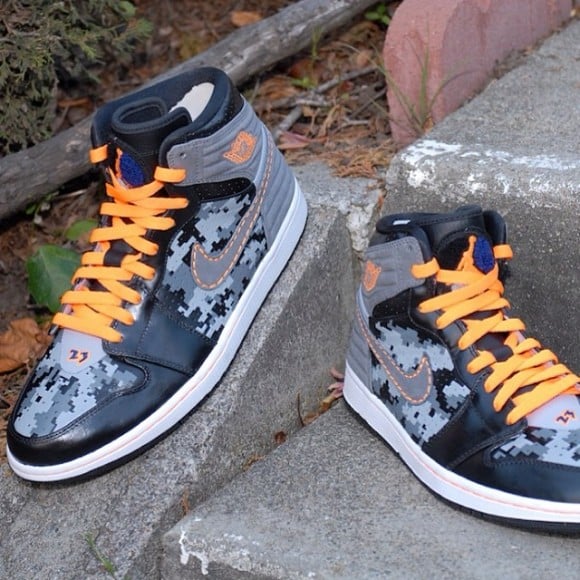 The Air Jordan 1 “Sneaker Hunter” customs by Have Air Customs areย grey and black, with bright orange accents throughout the entire shoe.The digi-camo print takes over the midfoot panels and toe box, which is enveloped by sleek, black leather. Grey suede dominates the rear and Nike Swoosh, and carries a lot of the orange accenting for the shoes. “23” branding appears at the base of the orange lacing, and original Jumpman patches ride high on the tongues.