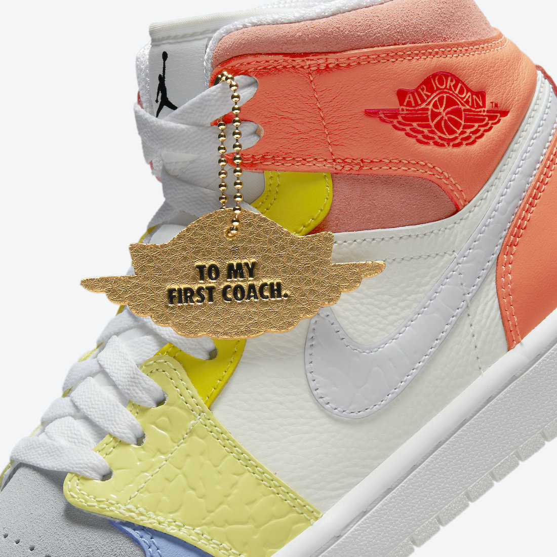 Included in the collection, we have the Air Jordan 1 Zoom Comfort, Air Jordan 1 Mid, and the Air Jordan 1 Low. Following, each pair will consist of Sail, White, Zitron, and Summit White. However, according to the photoshops, the pairs will also have shades of Blue, Orange, and Infrared. Also, each will have White on the Swoosh logos, laces, and midsole while Sail adorns the rubber outsole. Lastly, they will come with a Wings hangtag that reads โTo My First Coach.โ