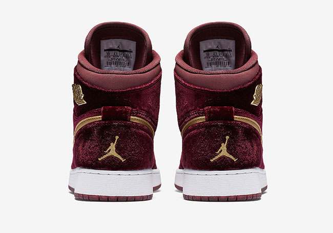 As you can see, this Air Jordan 1 combines Night Maroon and Metallic Gold color combination. Adding to the premium look, Jordan Brand has placed Velvet materials on the overlays while synthetic hits the toe and around the collar in the same hue. Metallic Gold is then placed on the Wings branding, Nike Swoosh on the sides and Jumpman on the tongue. Completing the look is White that runs through the midsole.