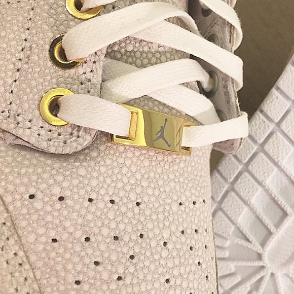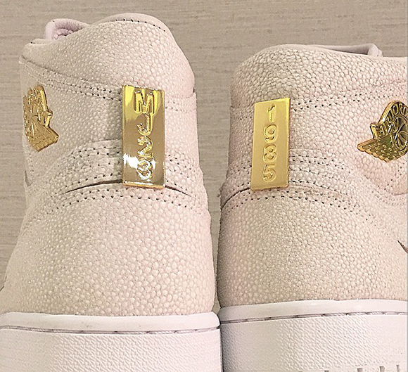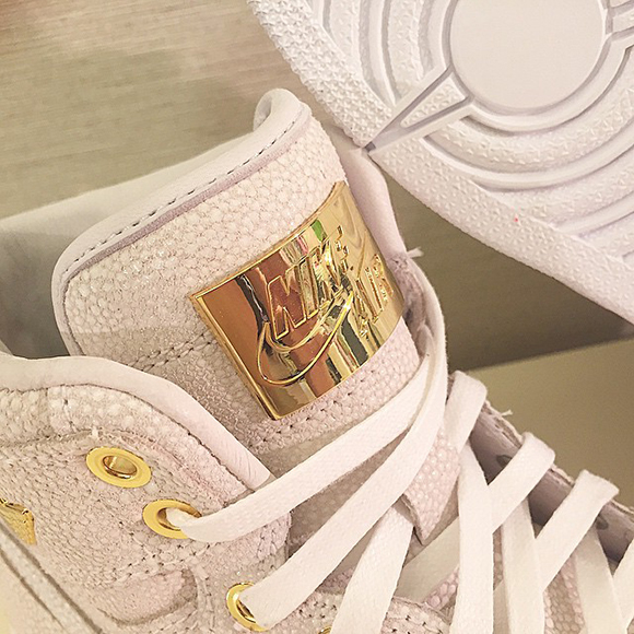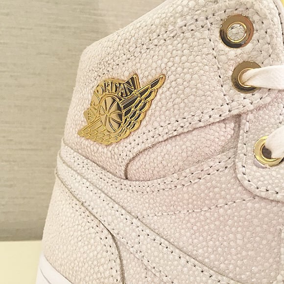 This Air Jordan 1 Pinnacle comes in predominate white but if you look closely at the uppers you can see the brand used a pebbled leather finish. Accenting the shoe is rumored to be 14k gold that can be seen on the eyelets, lace tops, heel, tongue and wings logo.