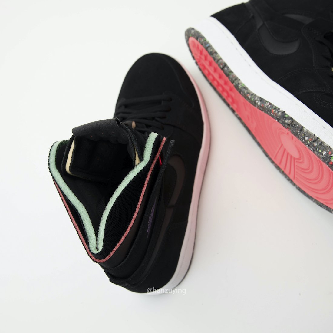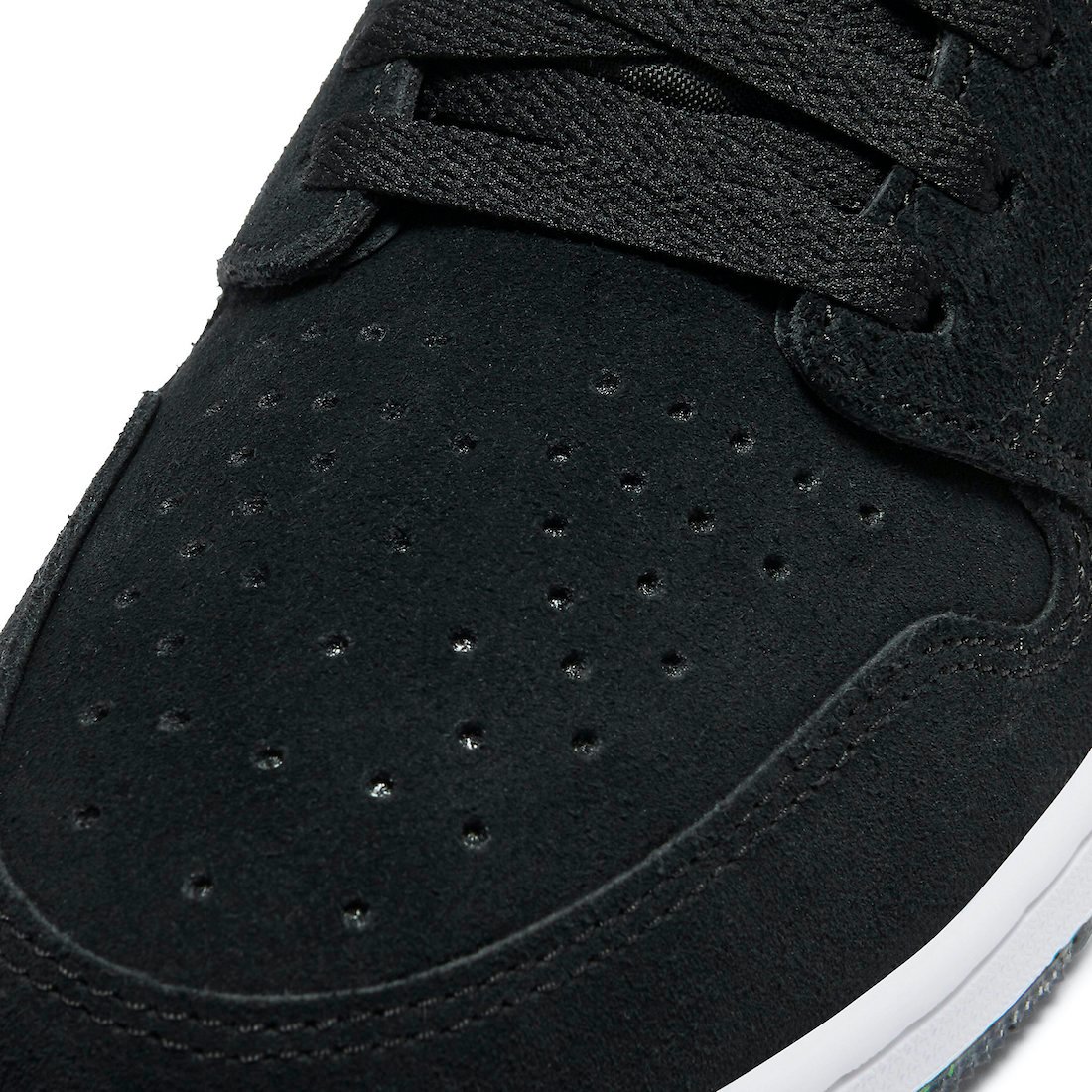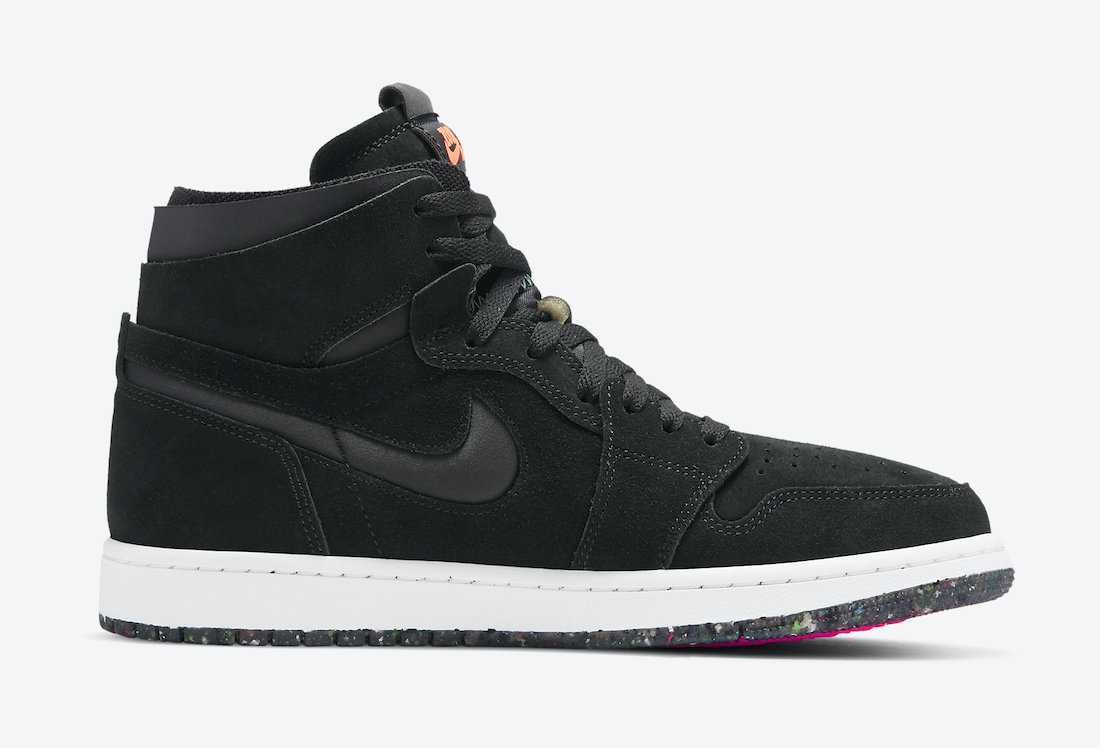 This variation of the Air Jordan 1 comes dressed in a Black, Court Purple, Hot Punch and Green Glow color combination. Looking closer they feature Black suede throughout the upper while leather is applied to the Swoosh. Following we have Green Glow on the exposed foam and Purple on the Wings logo. In addition we have White on the midsole and a Space Hippie inspired sole that also features Hot Punch.